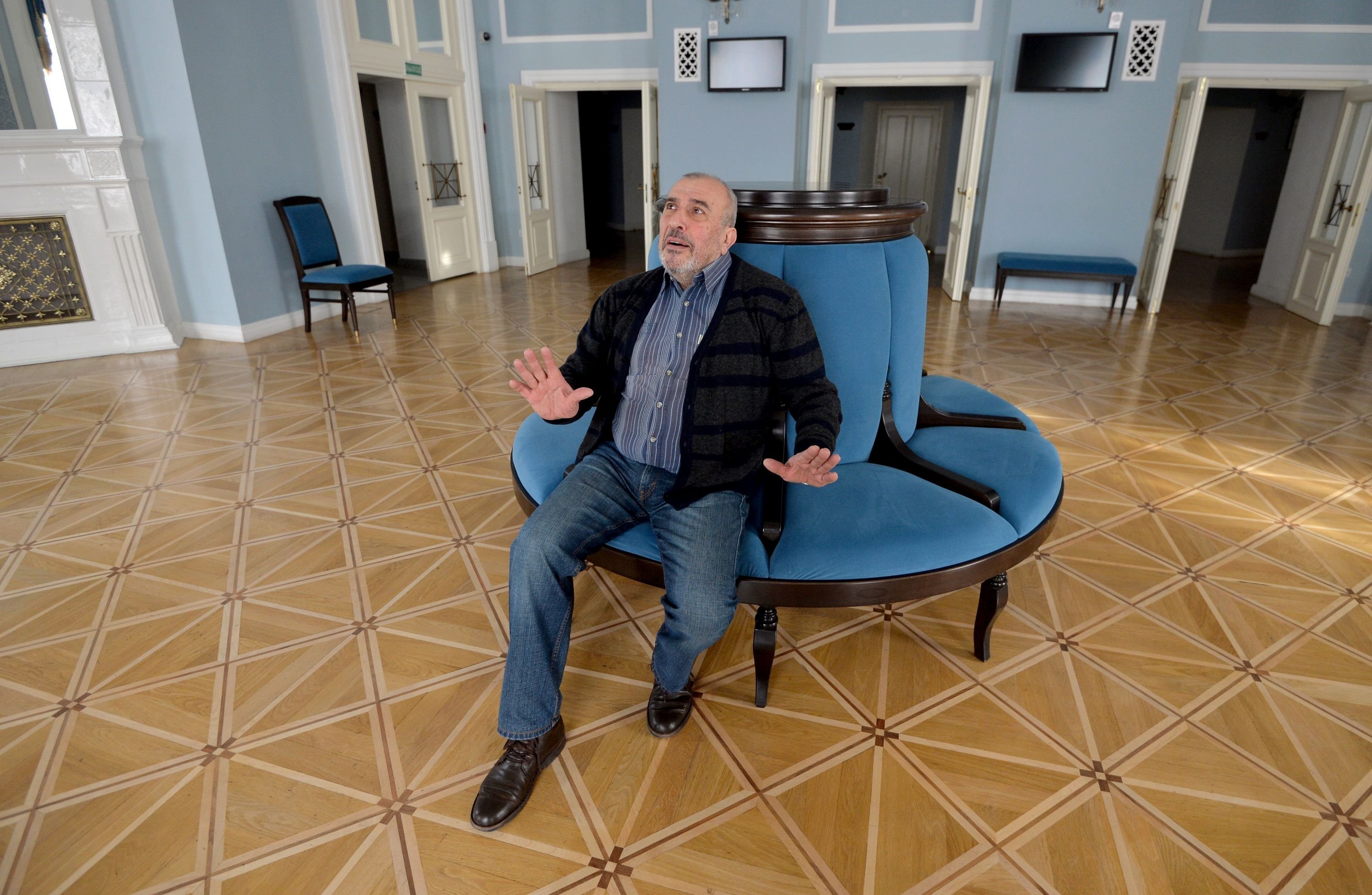 "Я люблю эту театральную незаменимость, когда нельзя ни заболеть, ни уехать, ни умереть. Если вечером спектакль, ты должен на нем быть. Я стараюсь даже на дачу не выезжать," — актер рассуждал о повседневном и проводил для корреспондентов Sputnik экскурсию по фойе театра.