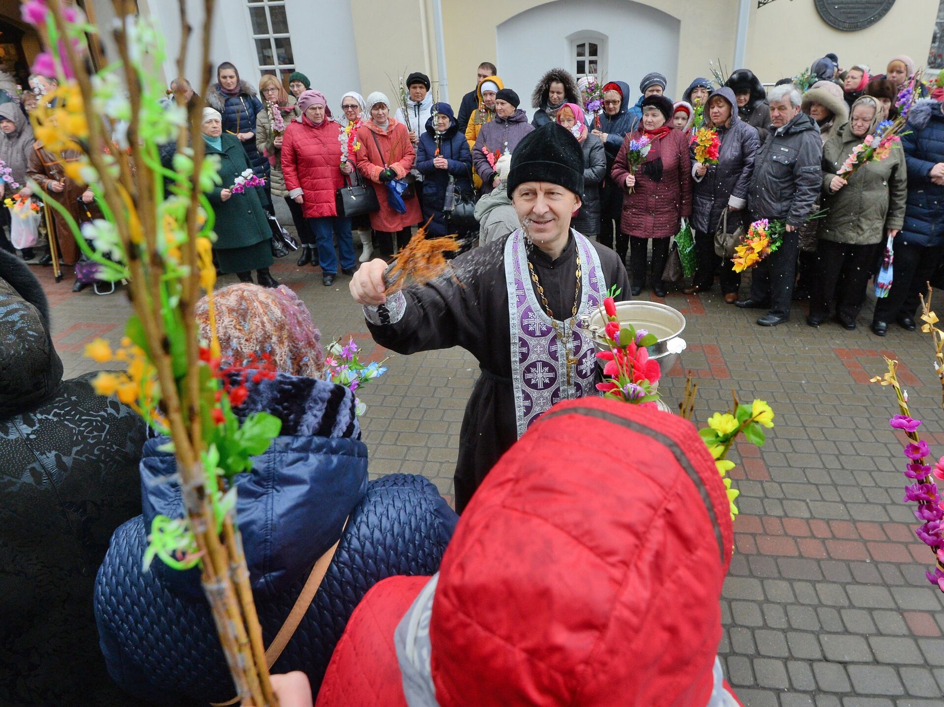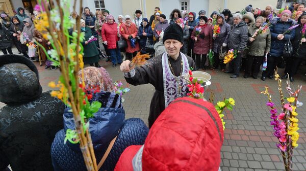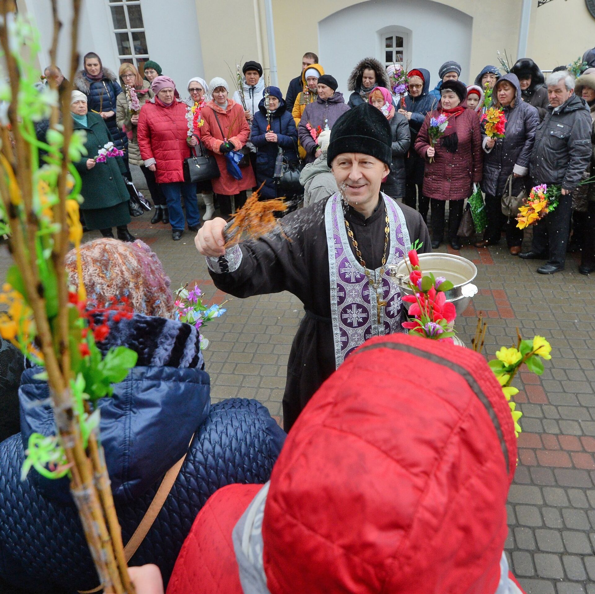 Многие приходят сегодня в храмы, чтобы освятить веточки вербы, которые нужно хранить до следующего года. Окруженные цветами, сосновыми веточками, деревянными божьими коровками и грибочками — веточки вербы сегодня украшают самыми разными способами, насколько хватает фантазии. Около храмов букеты продают и старушки, и дети, и взрослые. После того как прихожане храма выбрали вербу, они отправляются к ступеням церкви и становятся в очередь. Священник окропляет и вербу, и всех собравшихся святой водой.