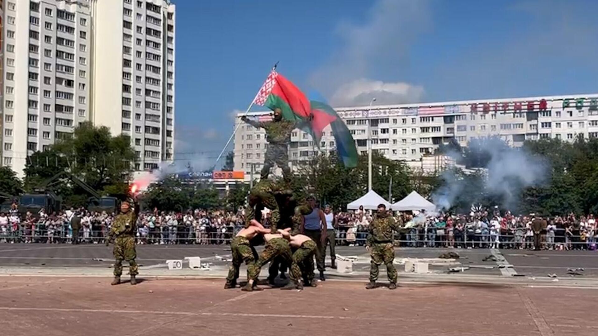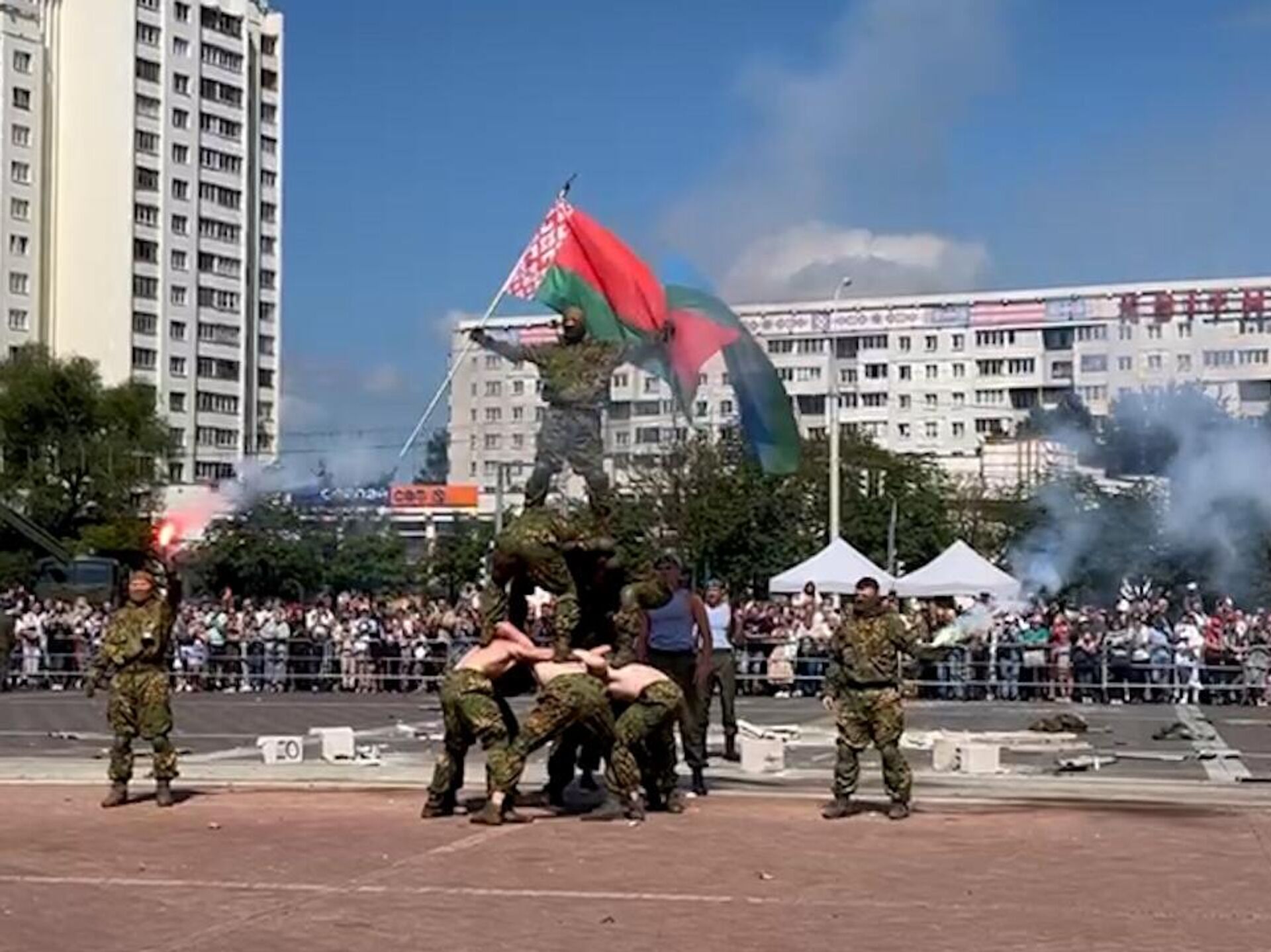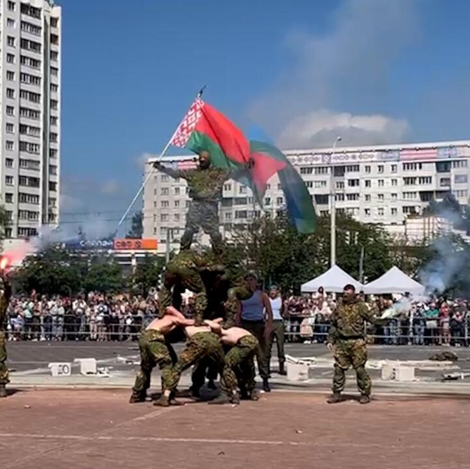 Открыли праздник прыжки сборной по парашютному спорту с борта вертолета. В команду входят и девушки-военнослужащие и их на земле встречали цветами.Экшн в исполнении белорусских разведчиков не заставил себя ждать, они продемонстрировали, как происходит спасение заложника.Роль захваченного боевиками военнослужащего выпала на долю военного летчика. Боевиков разведчики вычислили с помощью дрона. Дальше ― больше. Боевиков нашли, подавили огнем, заложника спасли.Самым интересным эпизодом боевой работы стала демонстрация возможностей беспилотников на современном театре боевых действий. Разведчики с их помощью не только уничтожали бронированную технику, но и отдельных боевиков, которых застали в засаде.Какие еще элементы боевой работы продемонстрировали бойцы сил специальных операций, смотрите в видео Sputnik.Самые интересные и важные новости ищите в нашем Telegram-канале и Viber. Также следите за нами в Дзен!