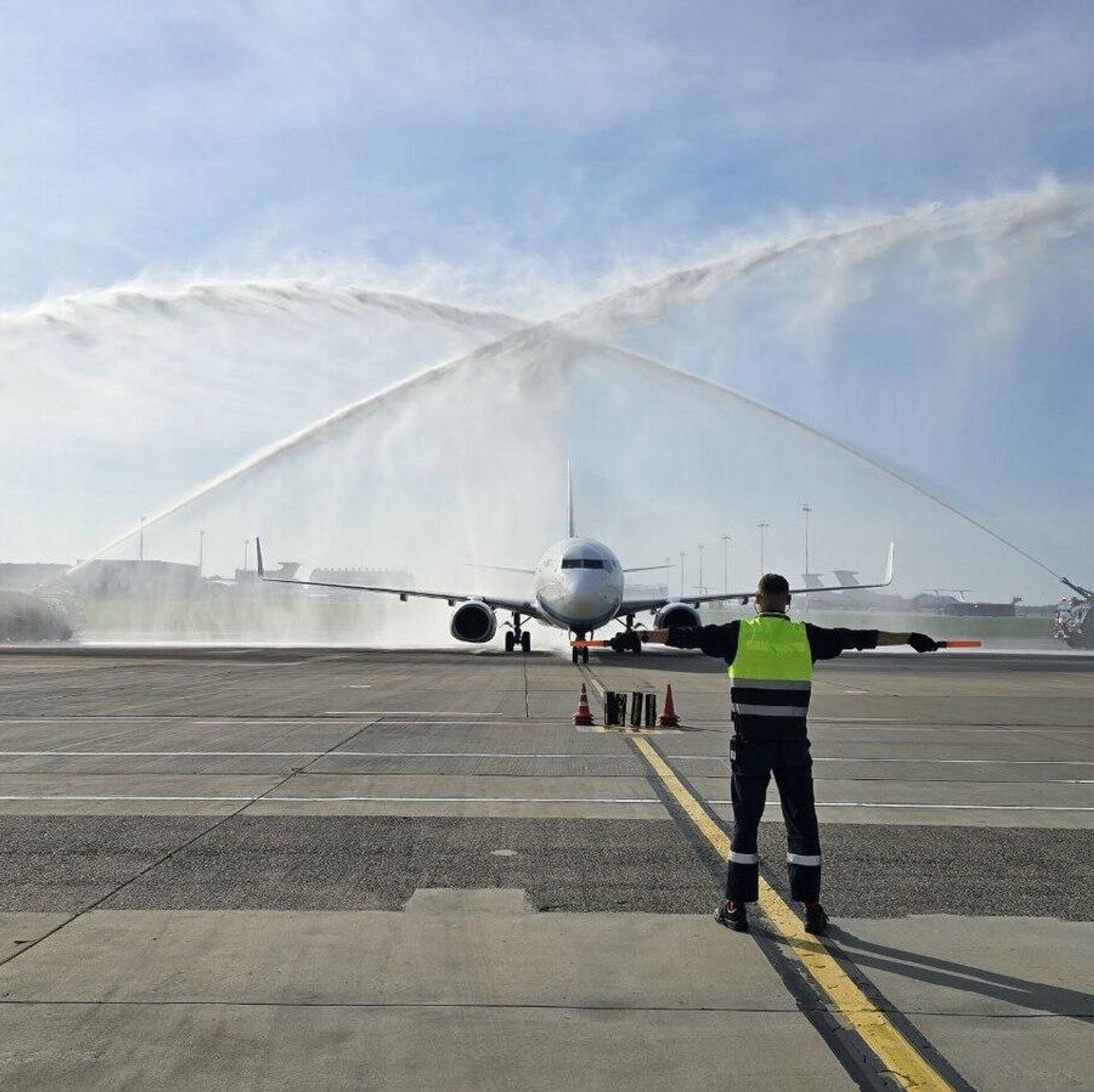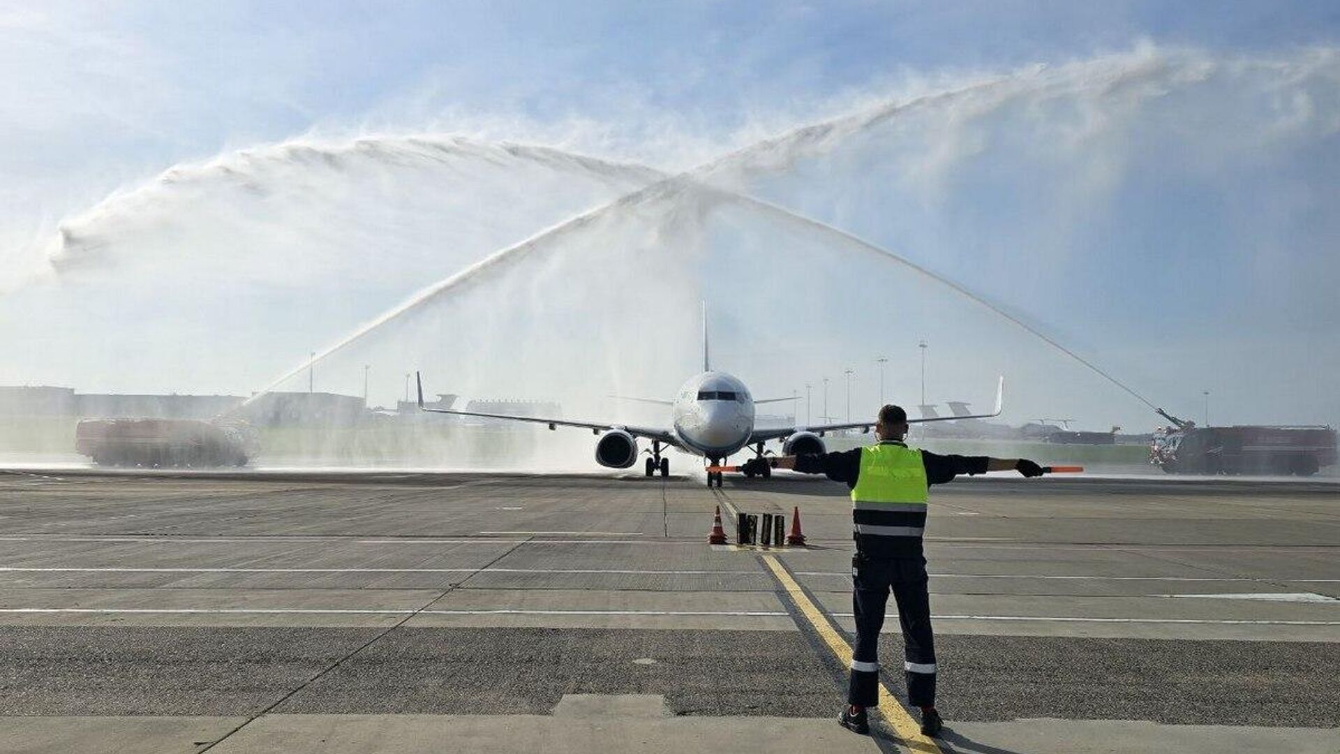 Первый борт торжественно прибыл в Минск в воскресенье 10 августа. По традиции его встретили водной аркой, а экипаж угостили хлебом-солью.