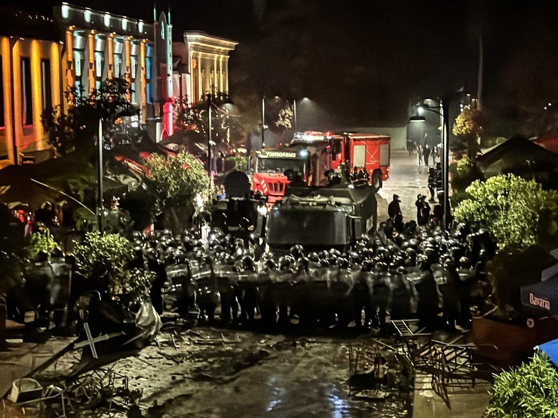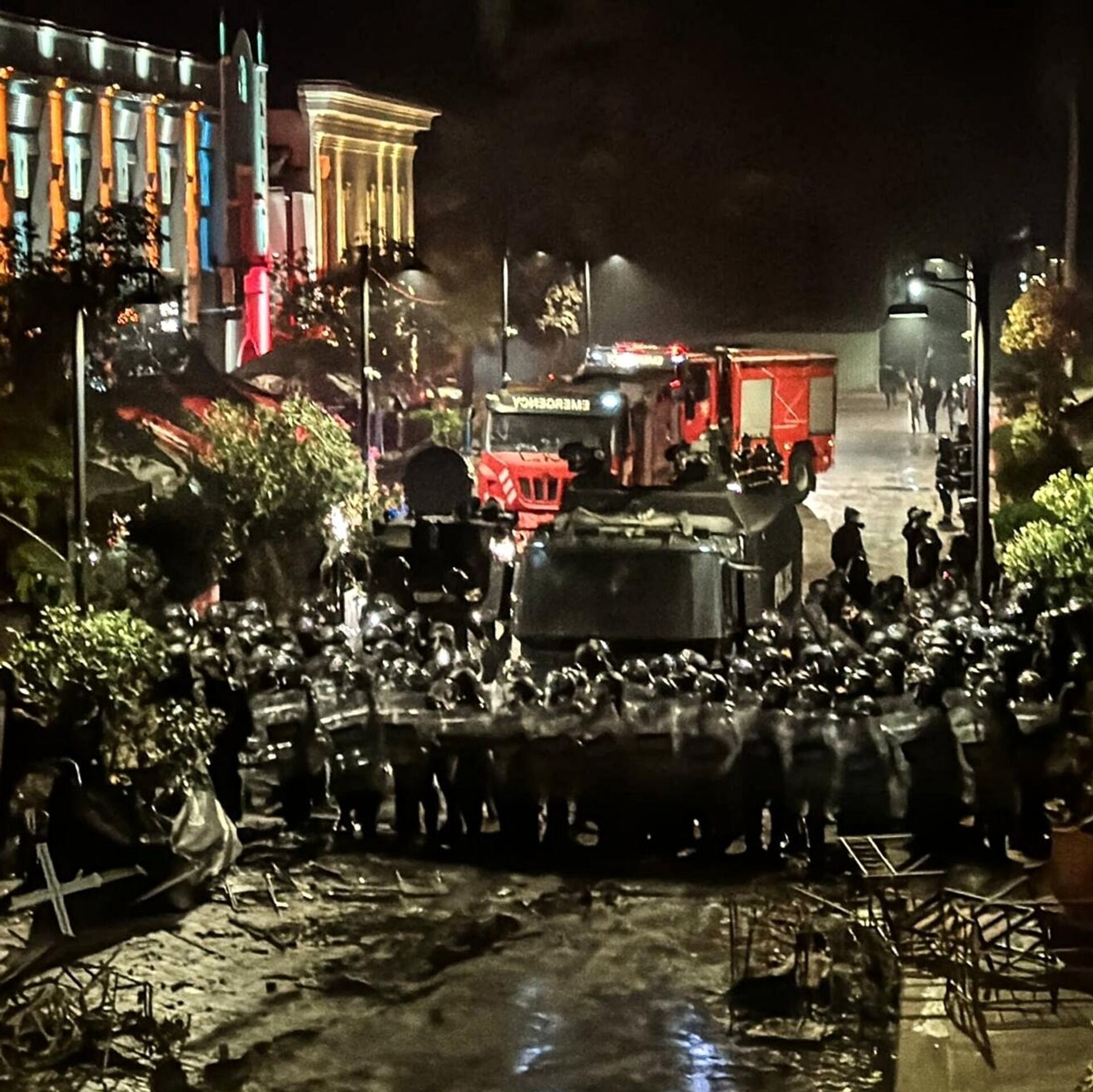 Грузинский спецназ тушил горящие баррикады водометами, их же применили, чтобы остудить пыл протестующих.