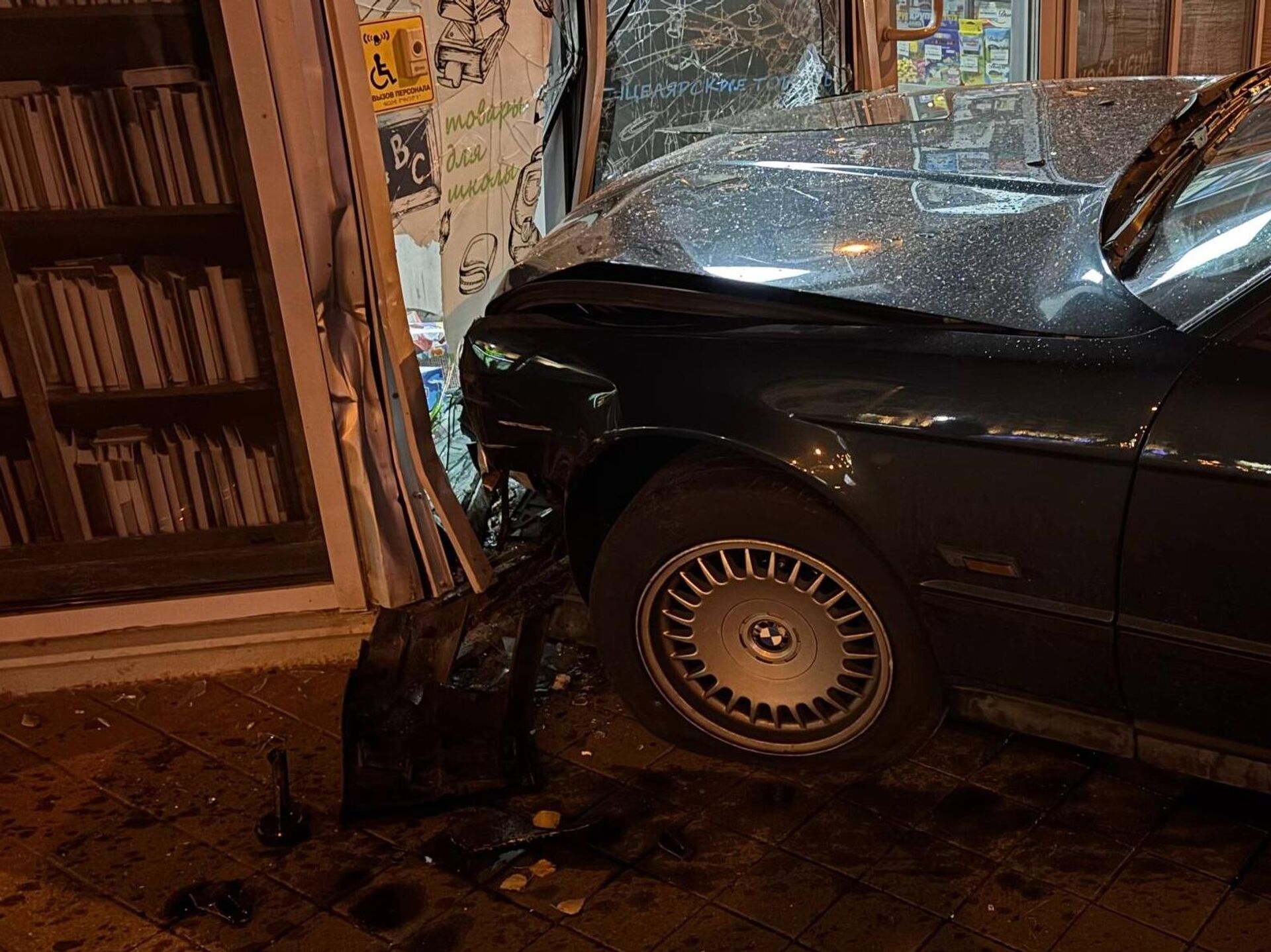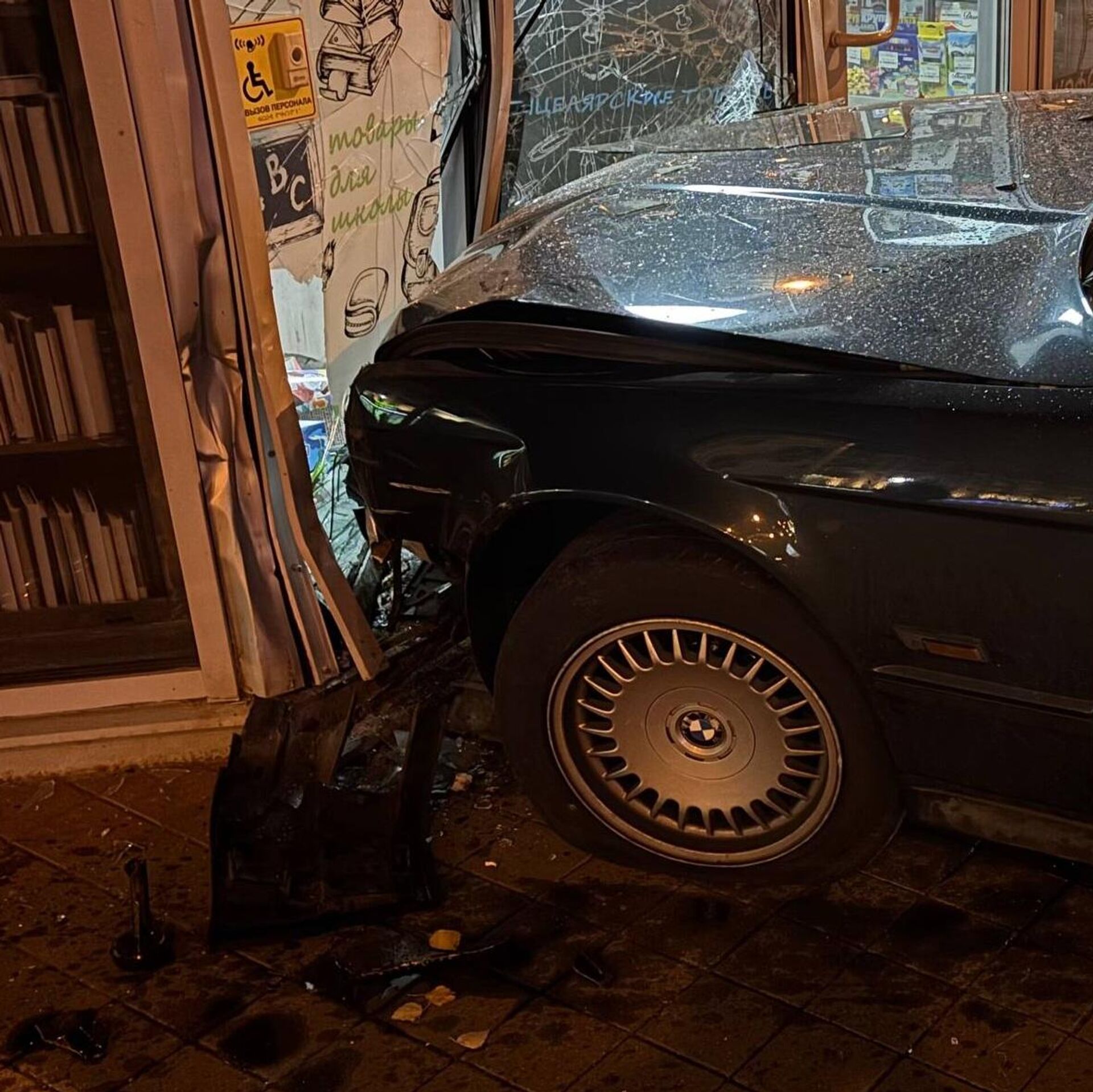 Как следует из опубликованных фото, автомобиль повредил стекло и дверь торгового павильона.