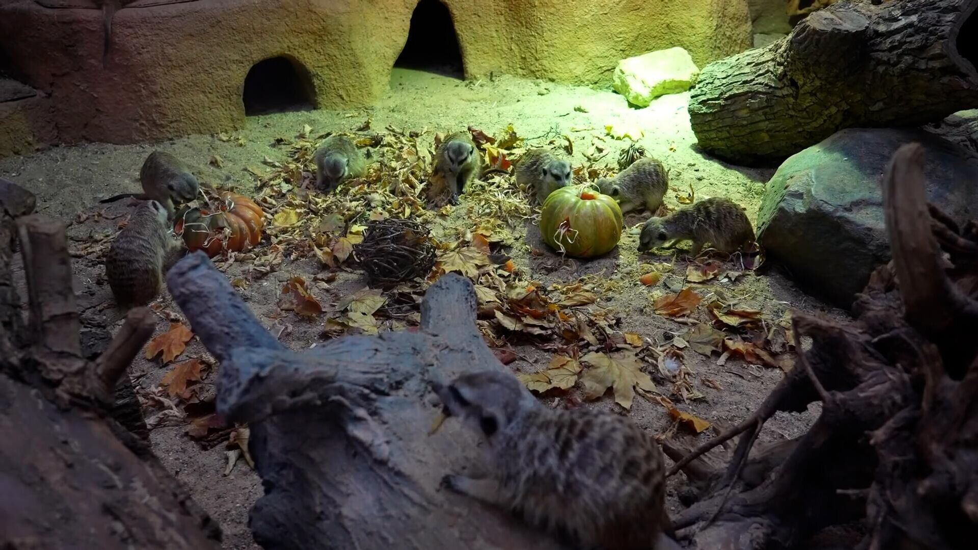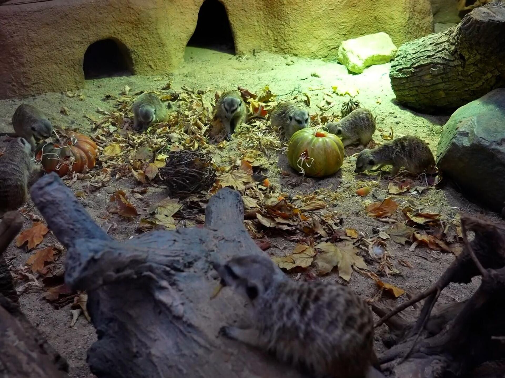 Сотрудники Московского зоопарка устроили праздник для семейства сурикатов ― в их павильоне организовали особую инсталляцию из тыкв, которые набили древесной шерстью, опавшими листьями и шариками из лозы.