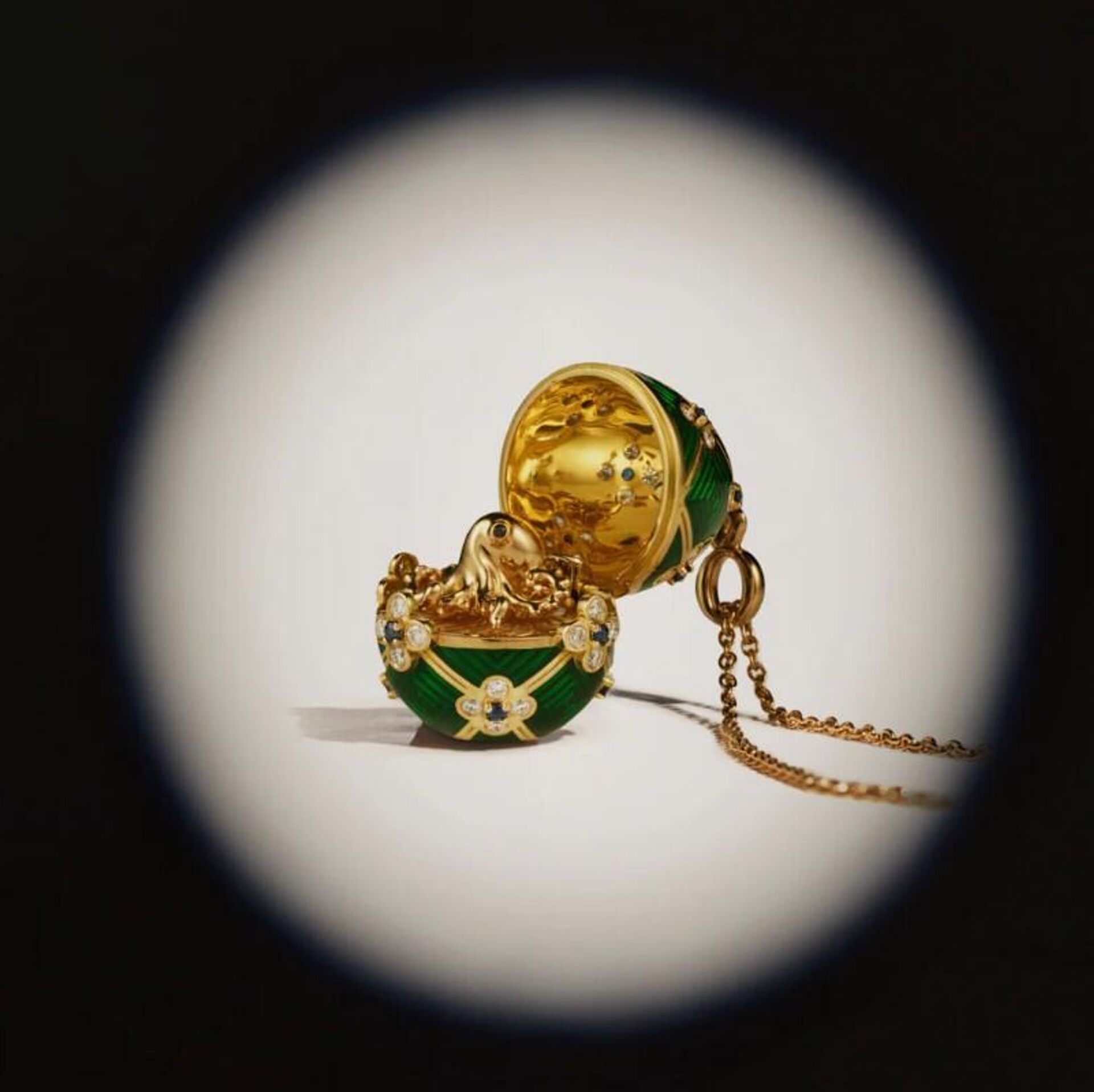 Кулон изготовлен из 18-каратного желтого золота и инкрустирован 60 белыми бриллиантами и 15 синими сапфирами. Золотой осьминог внутри украшен двумя черными бриллиантами.