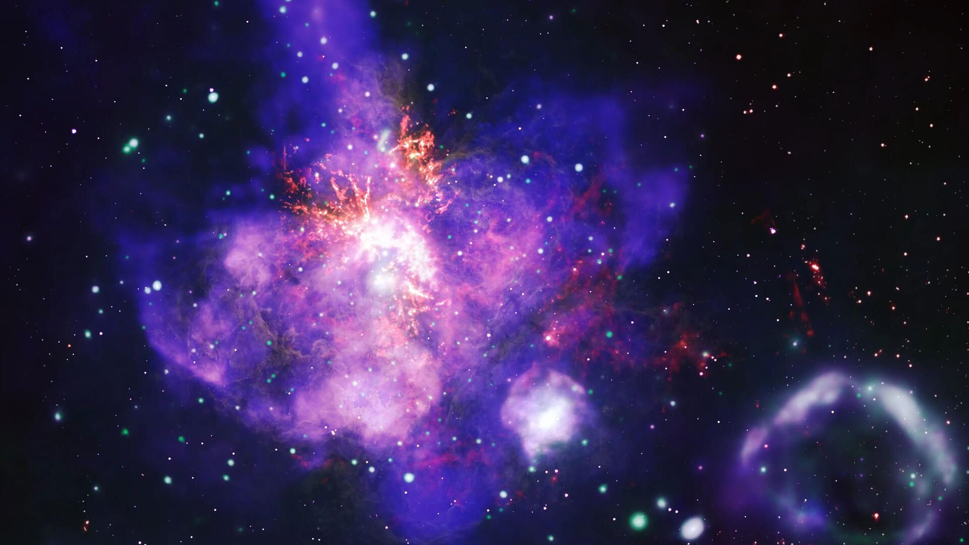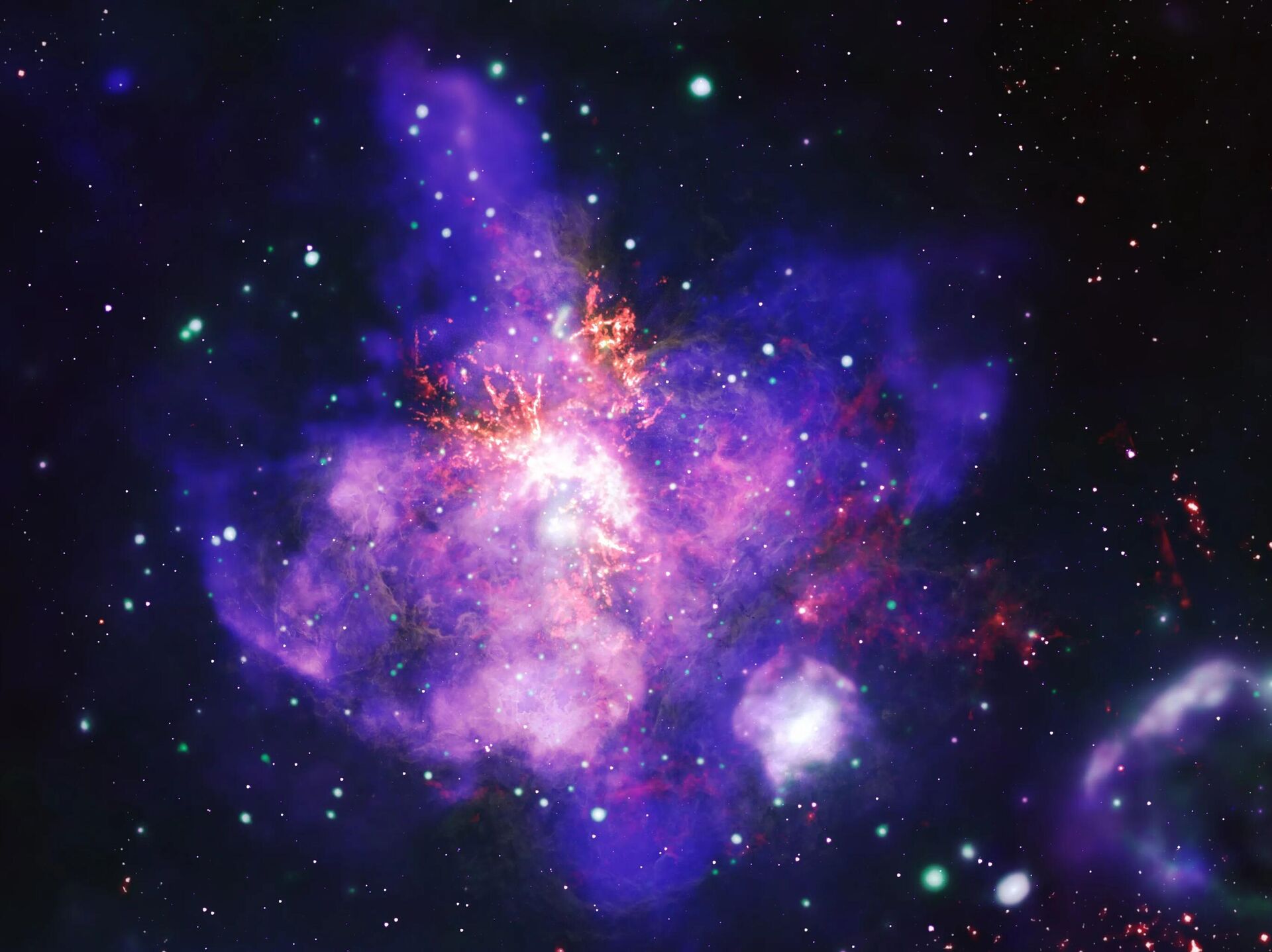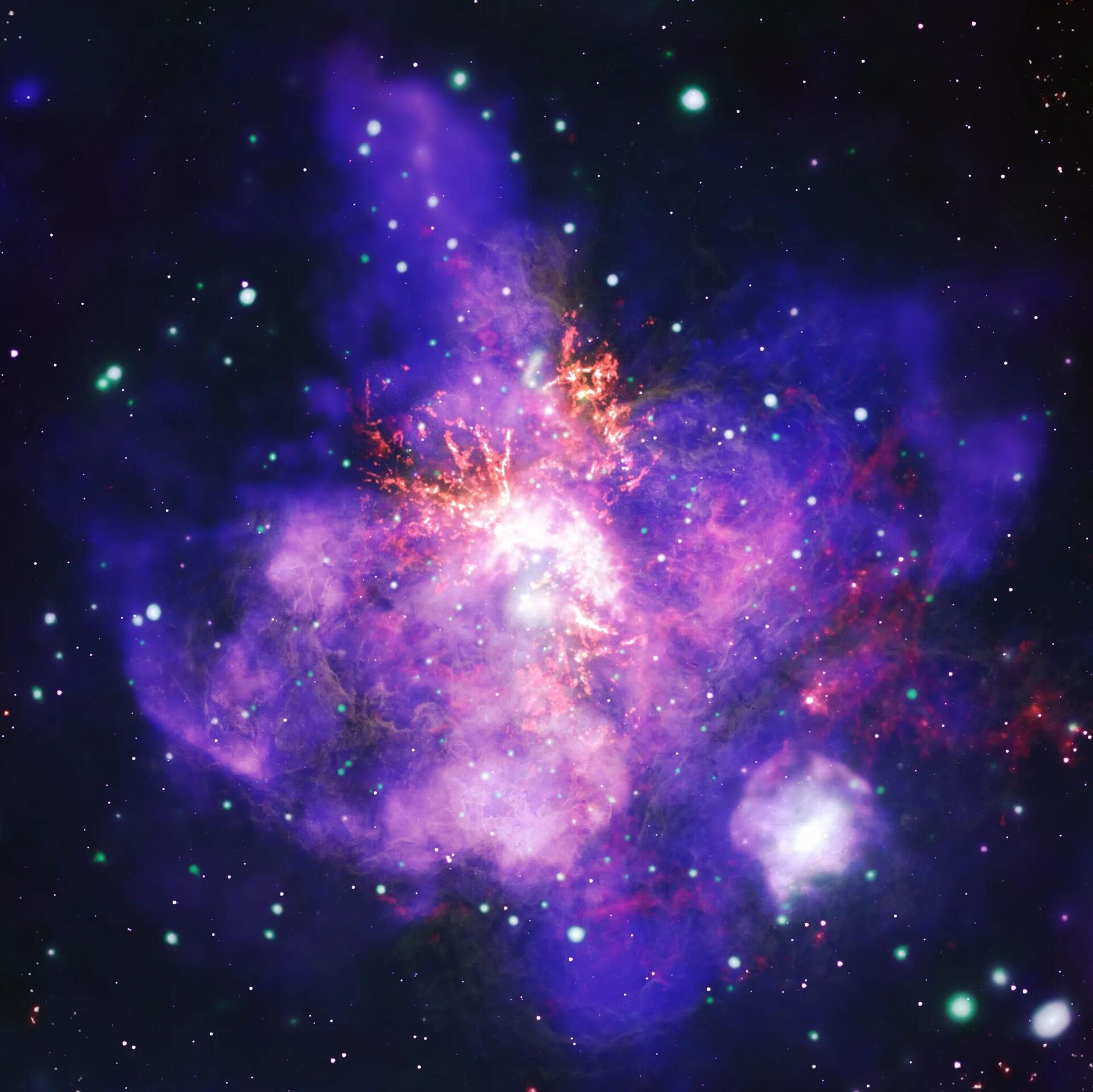 Это составное изображение туманности Тарантул из галактики Большое Магелланово облако, сделанное из снимков нескольких телескопов.