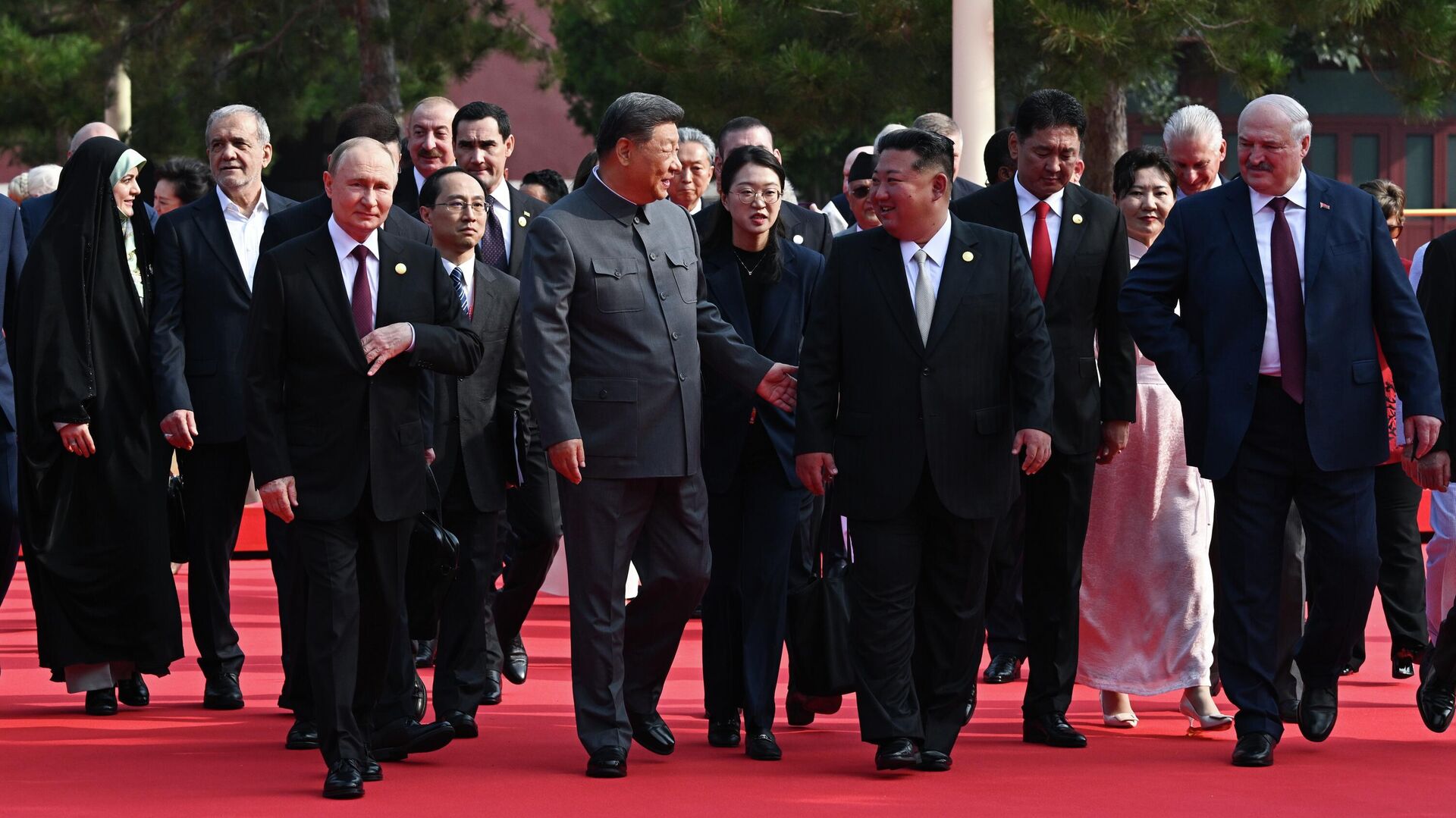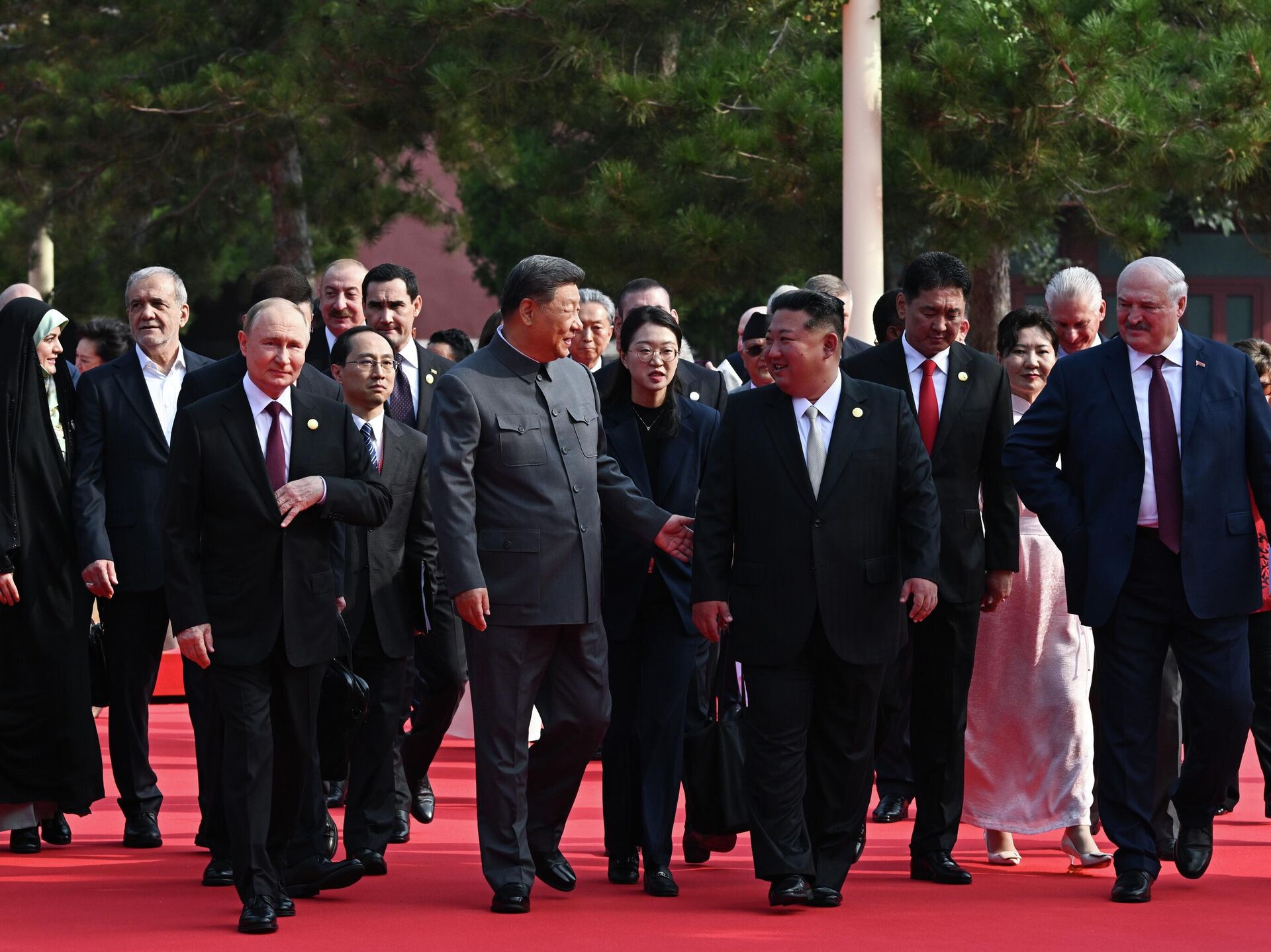 Президент РФ Владимир Путин, председатель КНР Си Цзиньпин, лидер КНДР Ким Чен Ын и президент Беларуси Александр Лукашенко (слева направо) на торжественных мероприятиях по случаю 80-й годовщины Победы китайского народа в войне с Японией и окончания Второй мировой войны (3 сентября 2025 года).