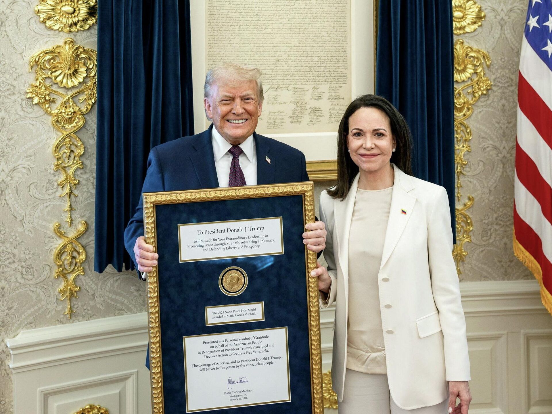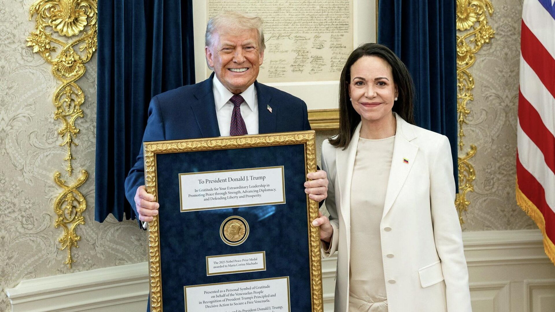 09:59 16.01.2026 (обновлено: 10:01 16.01.2026) Накануне лауреат премии мира из Венесуэлы Мария Корина Мачадо в течение двух часов беседовала с президентом США в Белом доме.