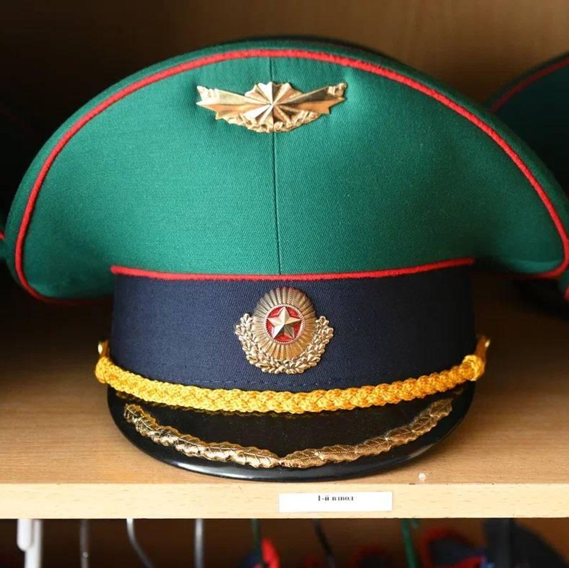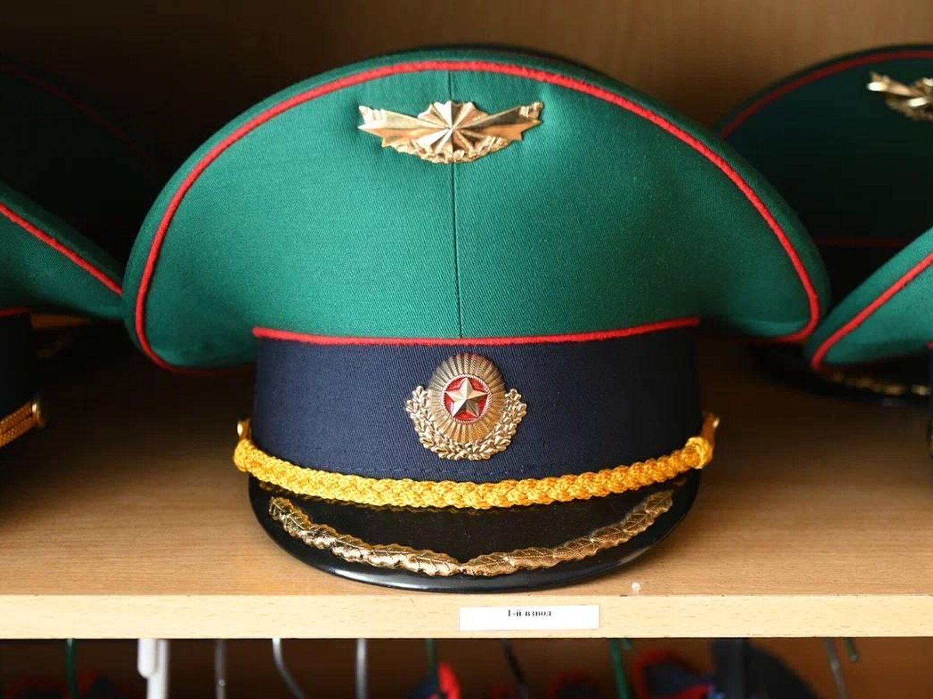 По бокам помещения стоят встроенные шкафы с парадной военной формой. У каждого бойца два комплекта одежды – летний и зимний. Они отличаются несколькими элементами: в летнем варианте вместо шинели – китель, а вместо каракулевой шапки – фуражка.