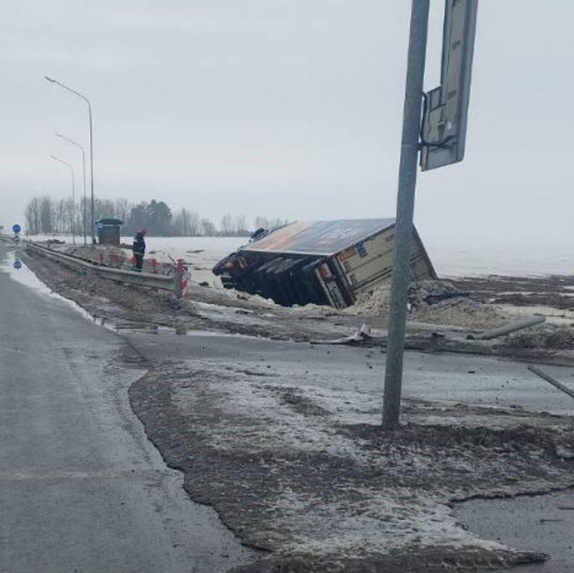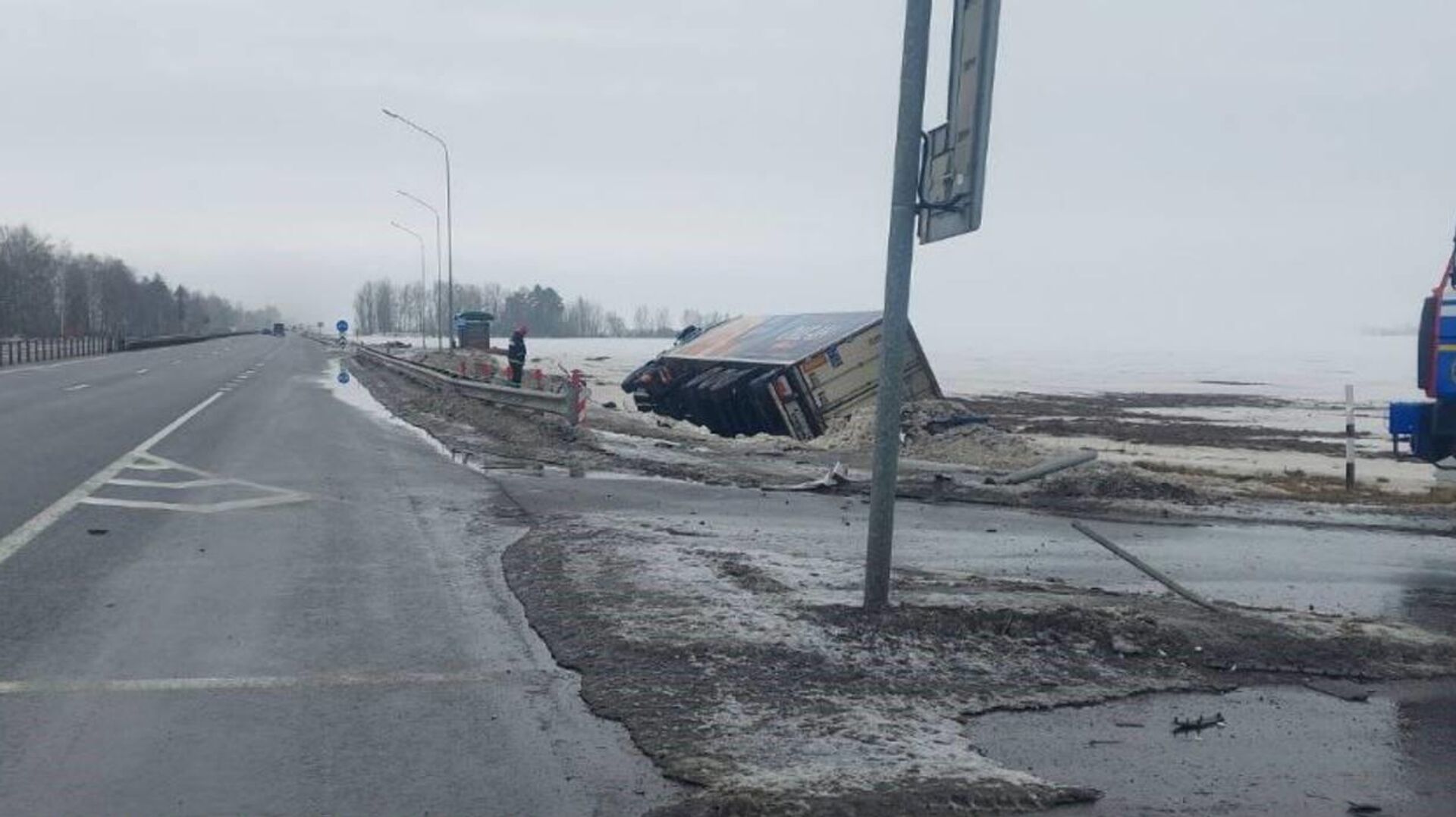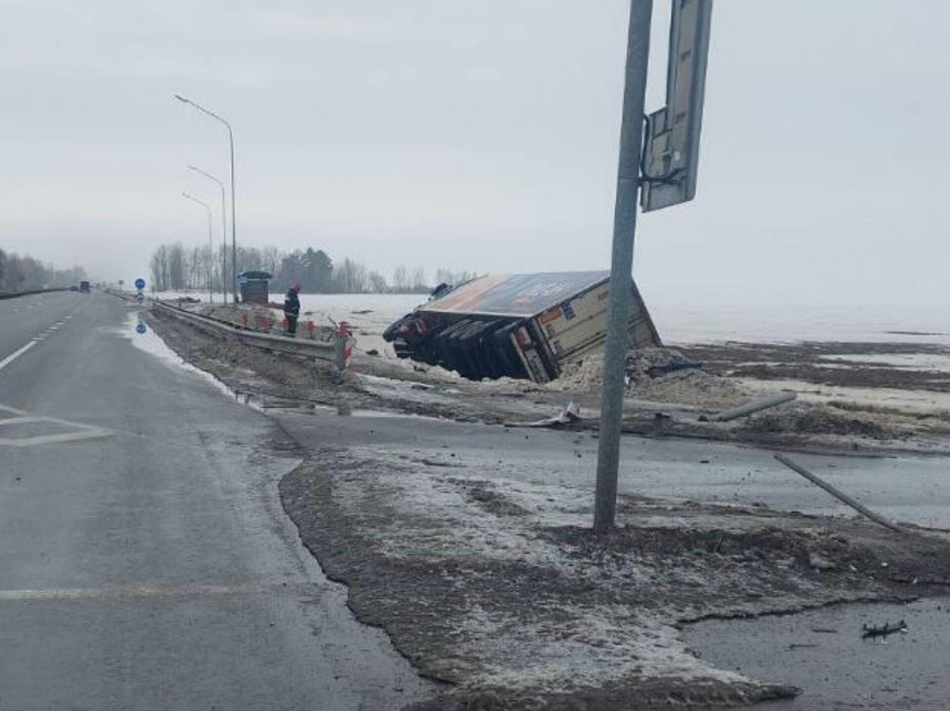 Грузовик после столкновения вылетел в кювет, где опрокинулся, в больницу доставлены два человека. 24.02.2026, Sputnik Беларусь