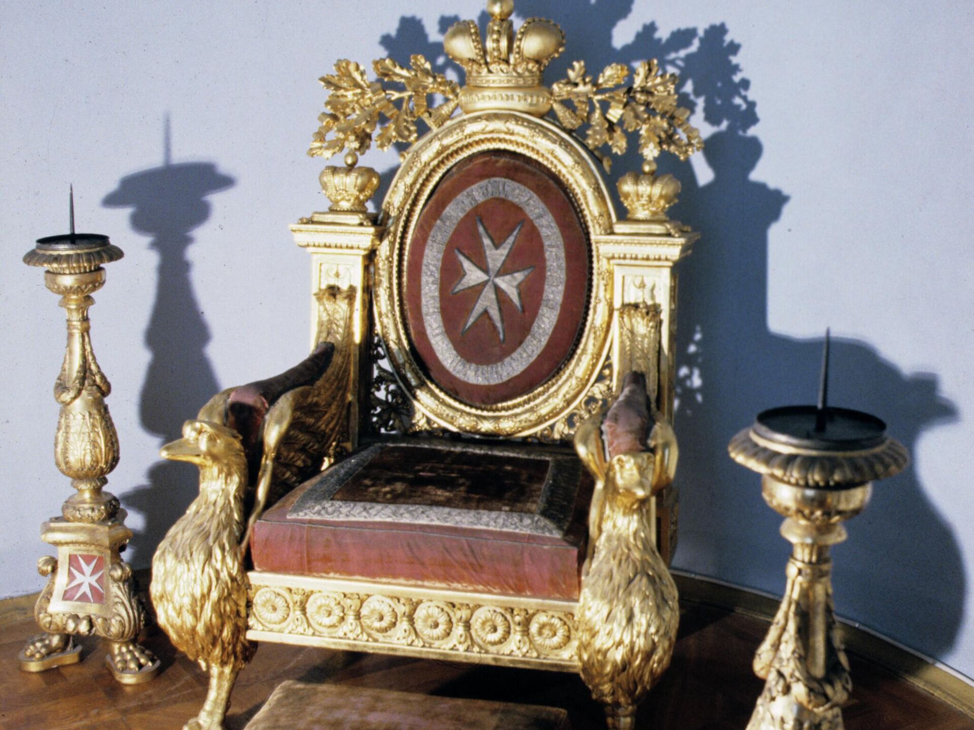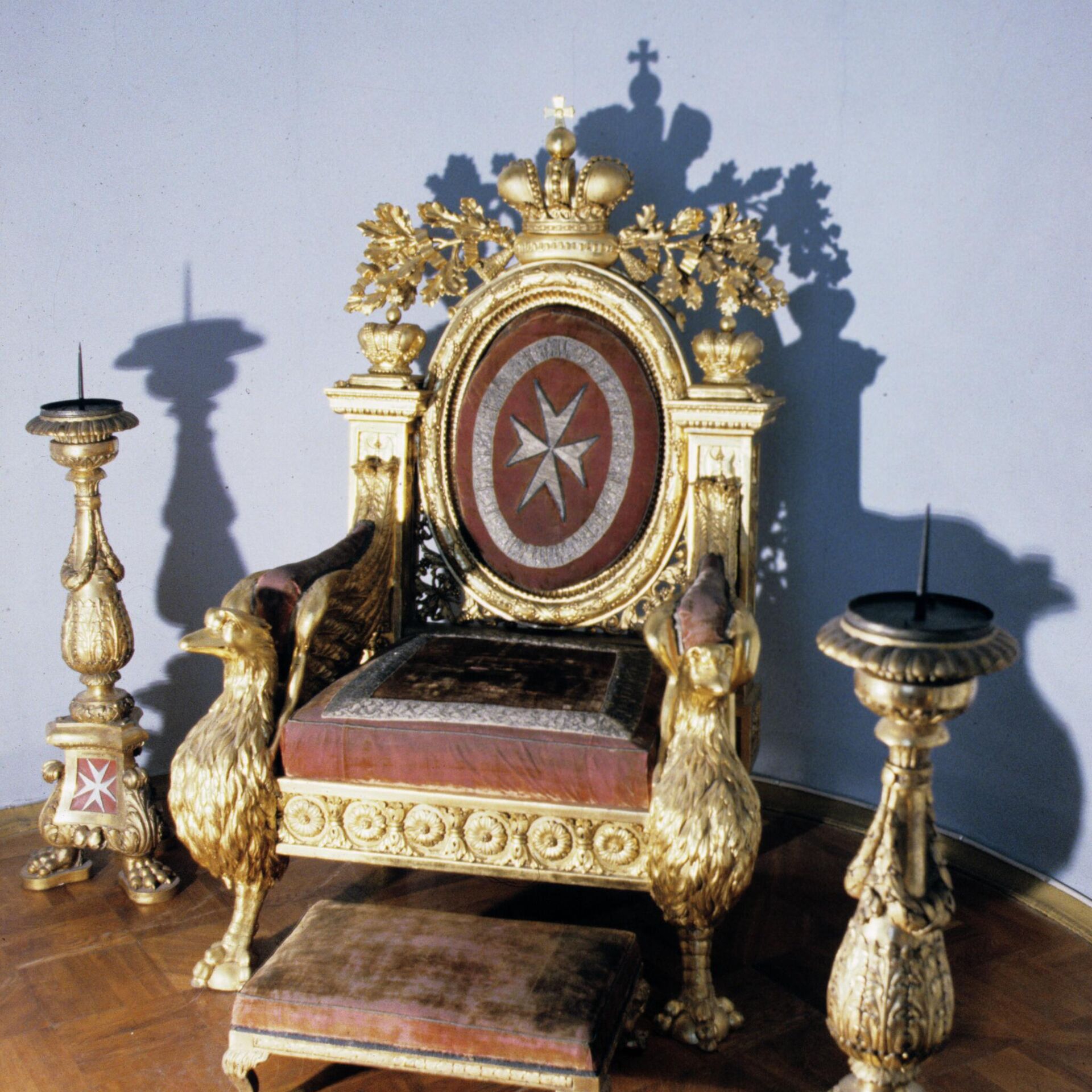 Трон и скамеечка были изготовлены в 1799-1800 годах по проекту архитектора Джакомо Кваренги специально для императора Павла I, который в 1798 году был провозглашен Великим магистром Мальтийского ордена.