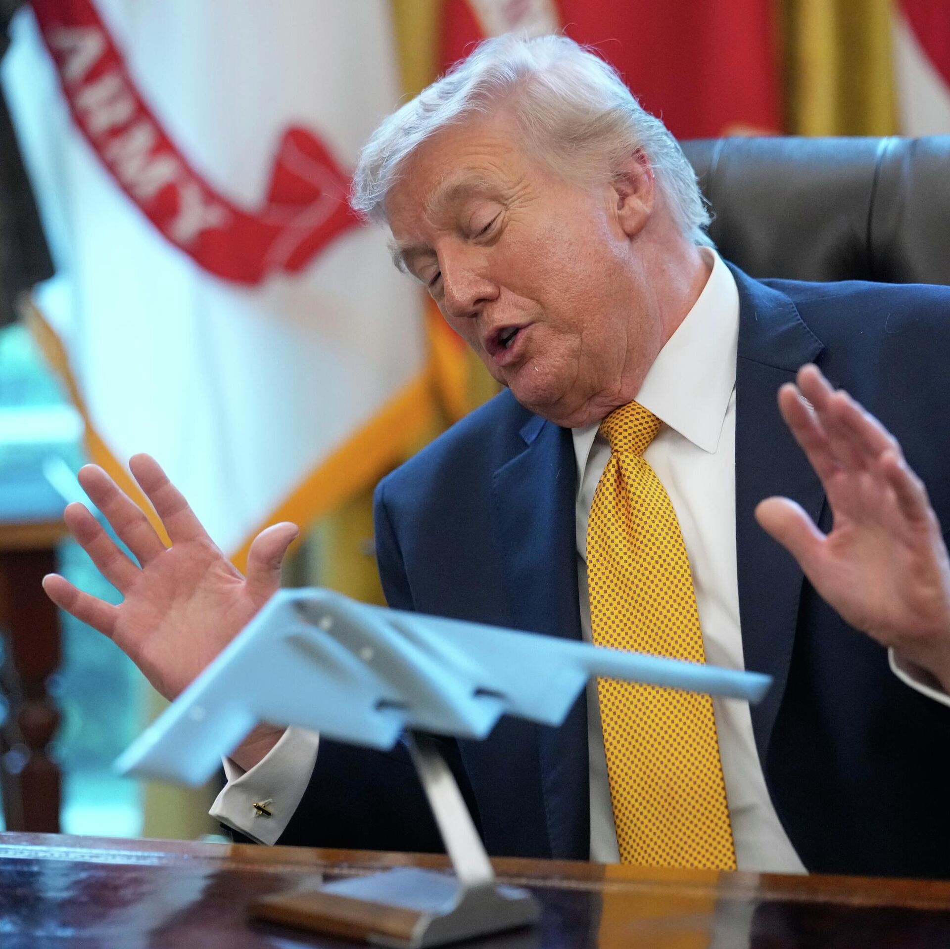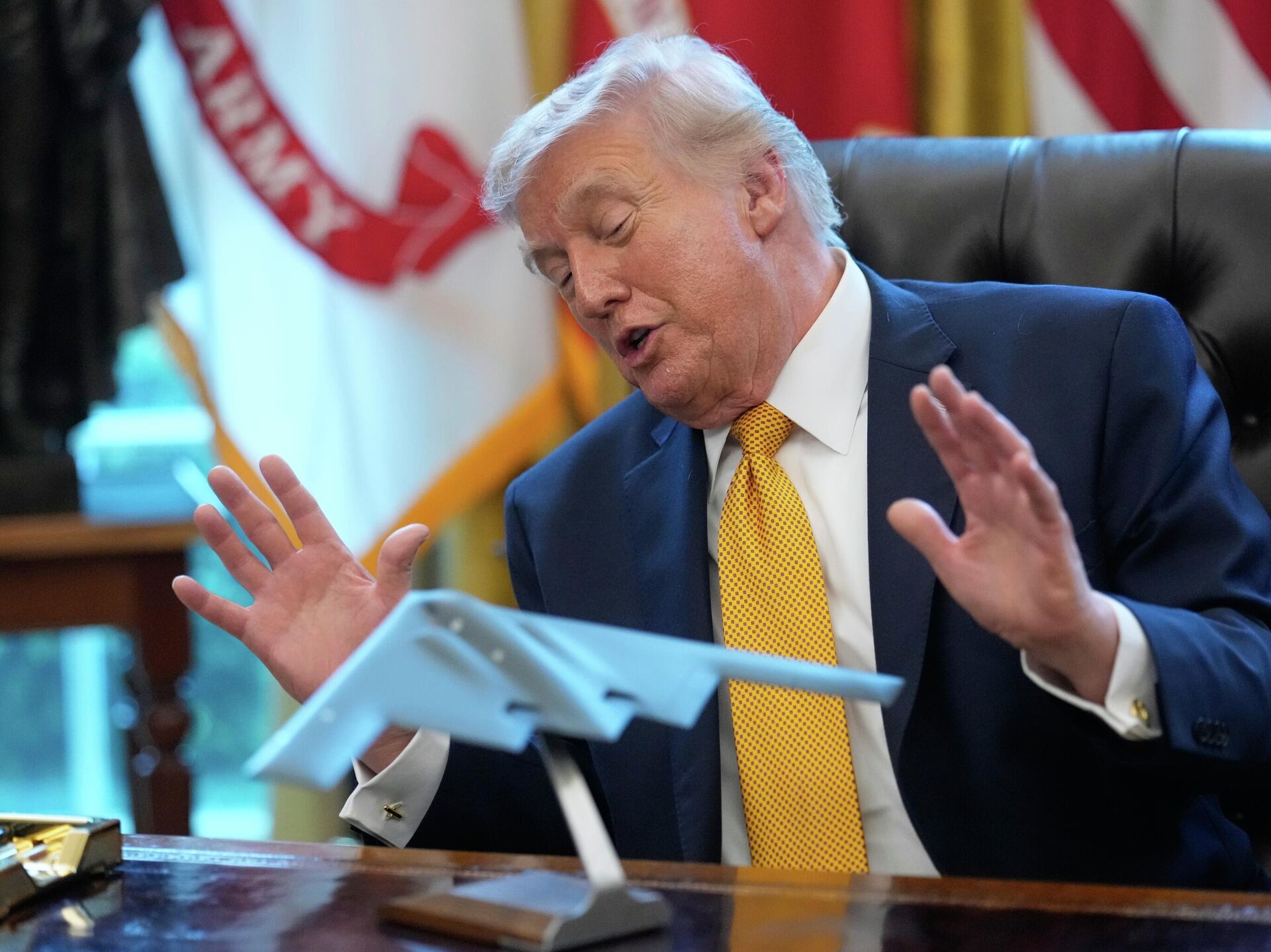 "Видите этого мужчину? Знаете, кто это? Покойный великий Уинстон Черчилль", – сказал Трамп в Белом доме, указав представителям СМИ на бюст Черчилля.