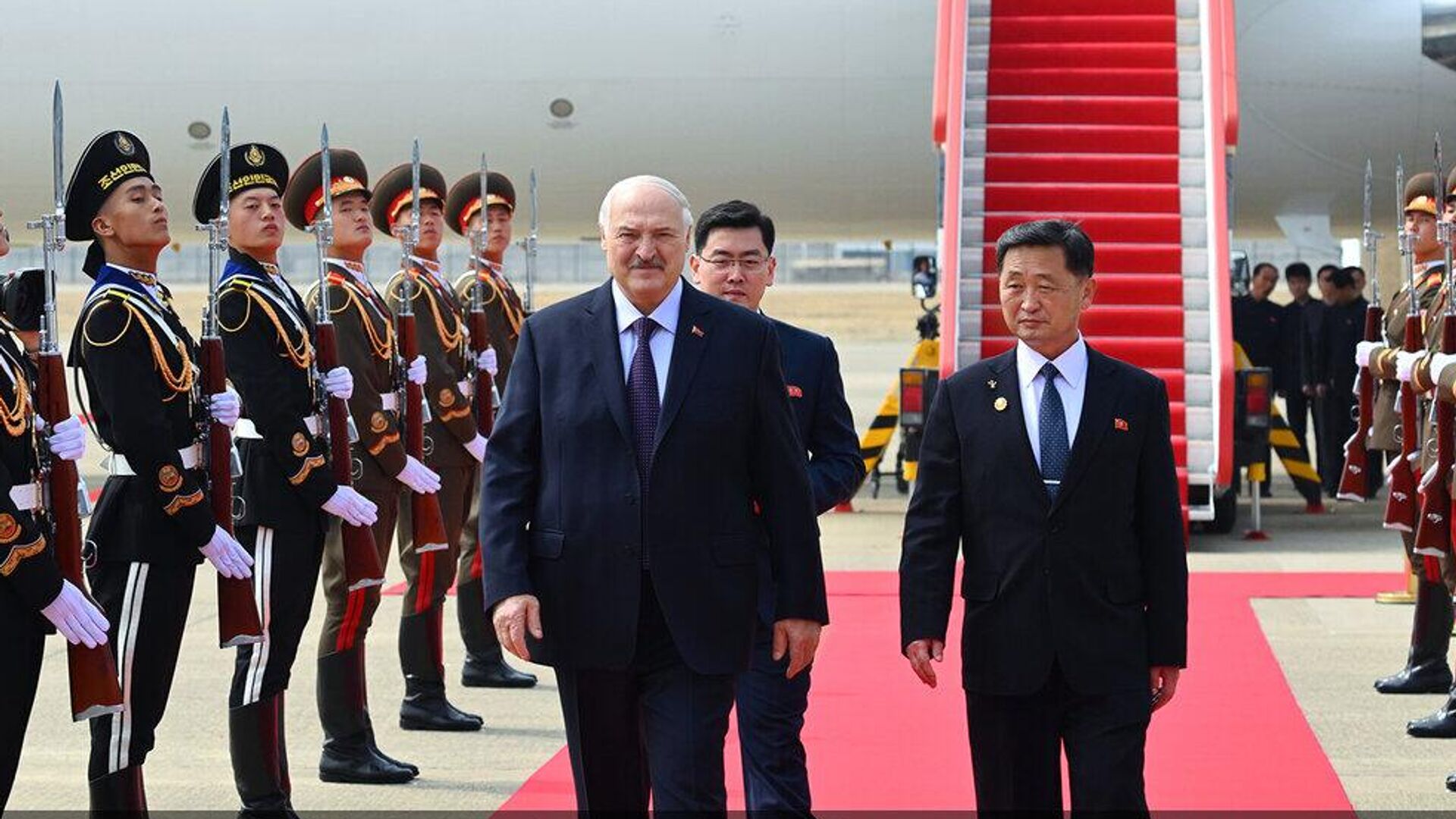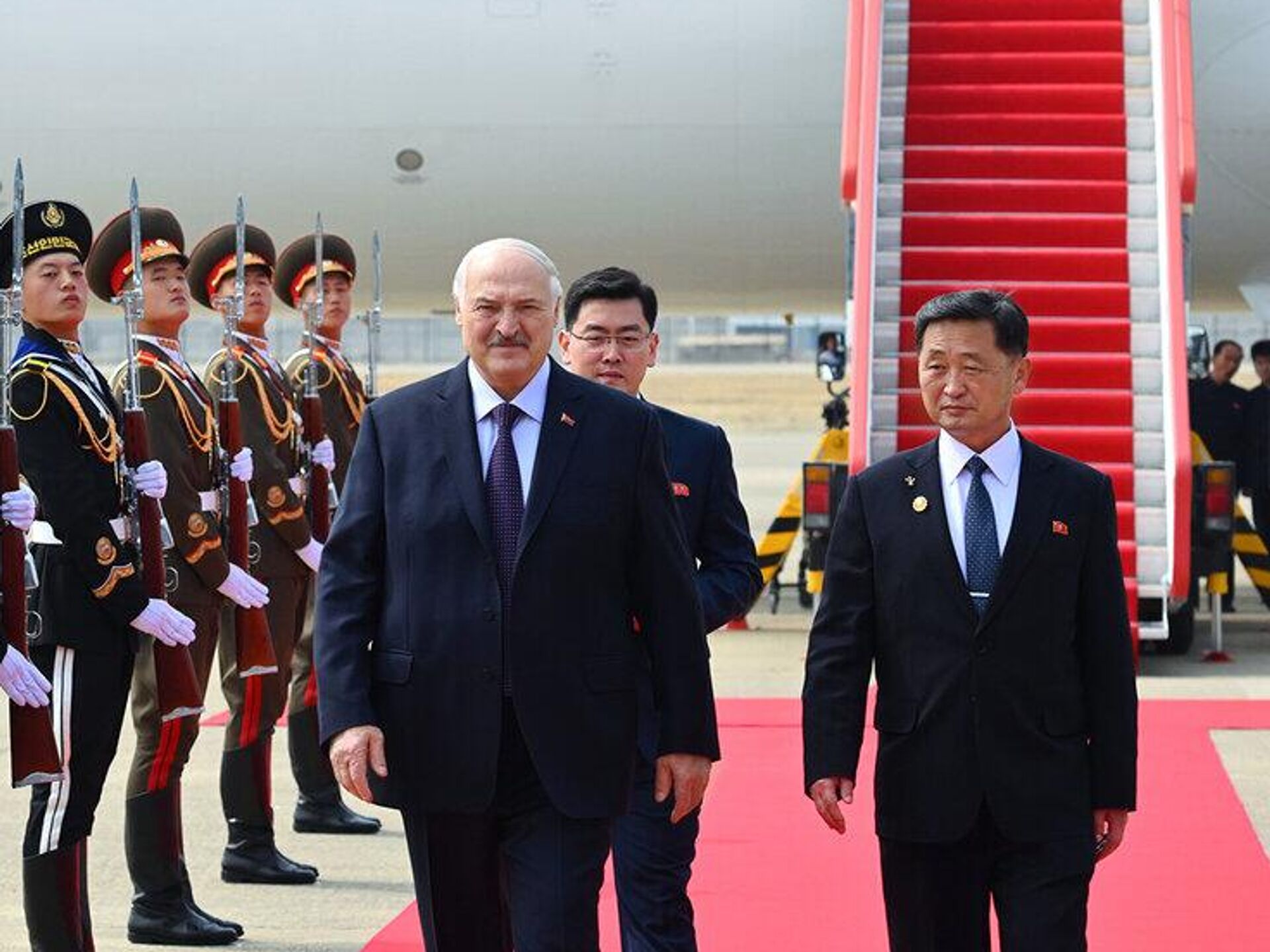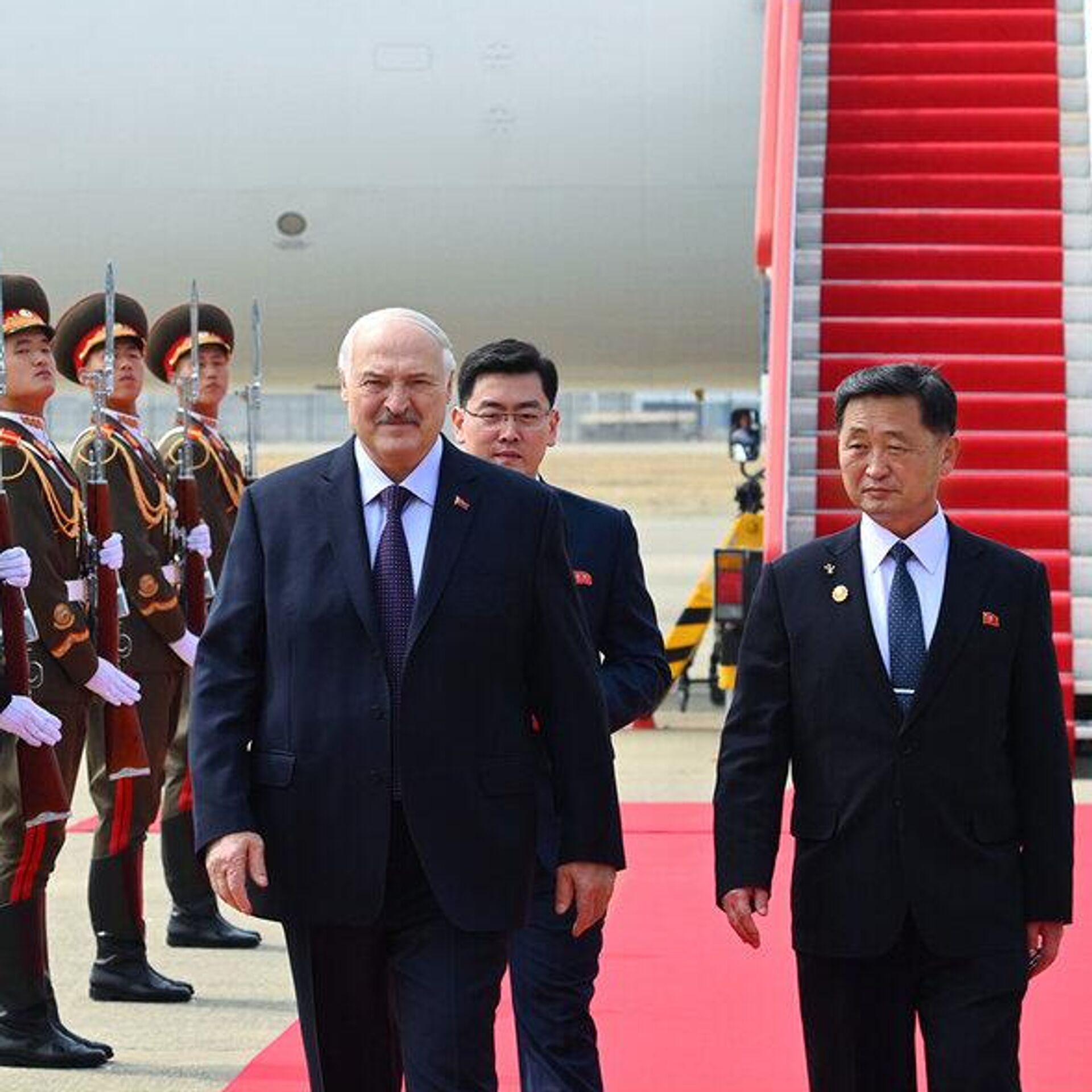 У трапа белорусского лидера встретили первый заместитель премьер-министра КНДР Ким Ток Хун и глава МИД Беларуси Максим Рыженков.