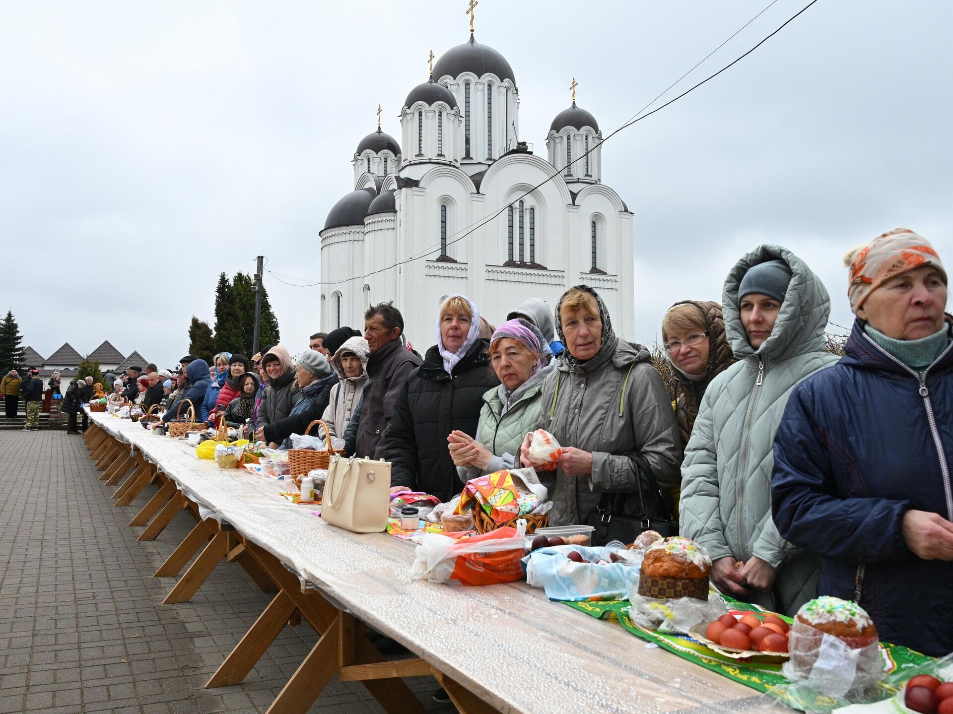 В Великую субботу православные храмы традиционно наполняются прихожанами, и минский храм-памятник Всех Святых не стал исключением. Несмотря на пасмурную погоду, верующие всех возрастов — от семейных пар вместе с малышами до пожилых людей — пришли в церковь, чтобы освятить куличи и яйца, собранные в праздничные корзины.