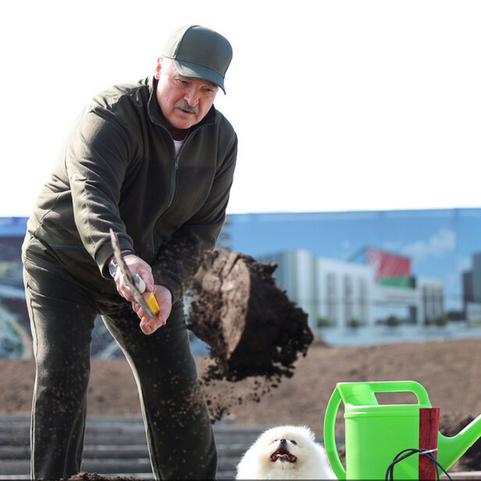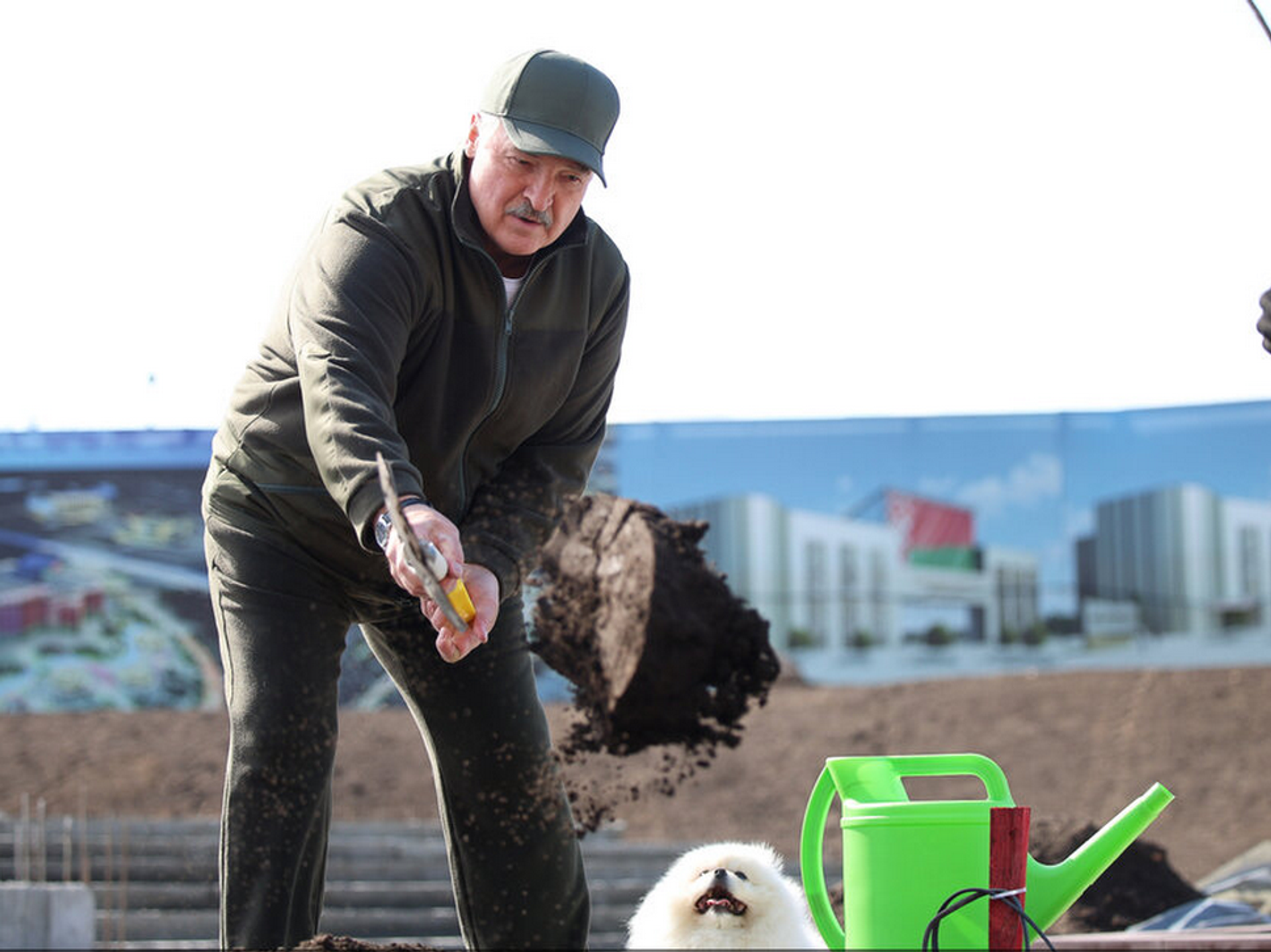 Фотофакт: Лукашенко со шпицем Умкой высадил деревья на субботнике