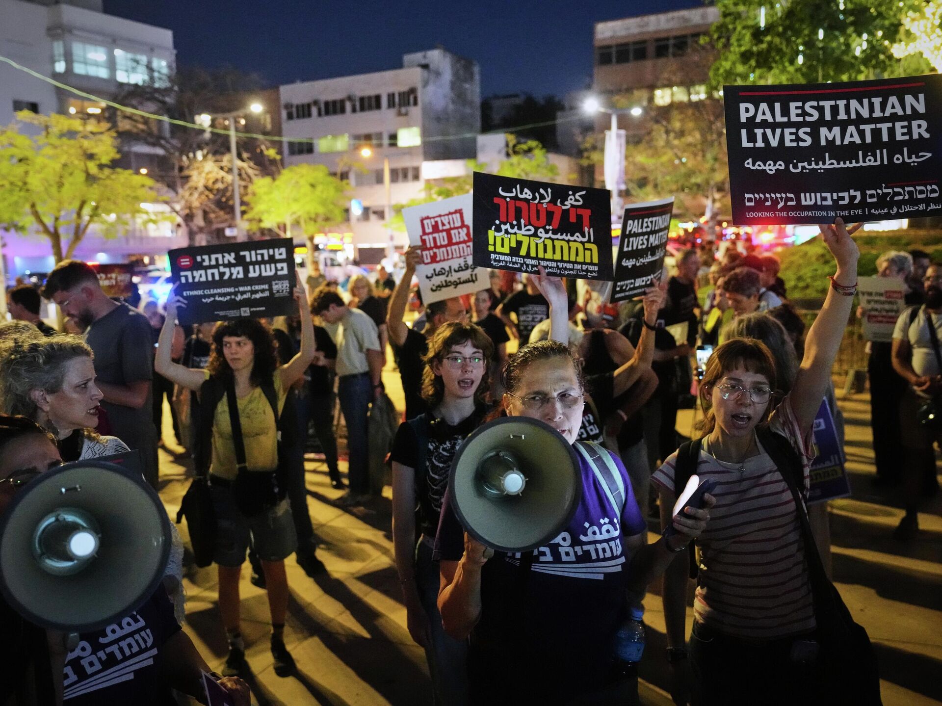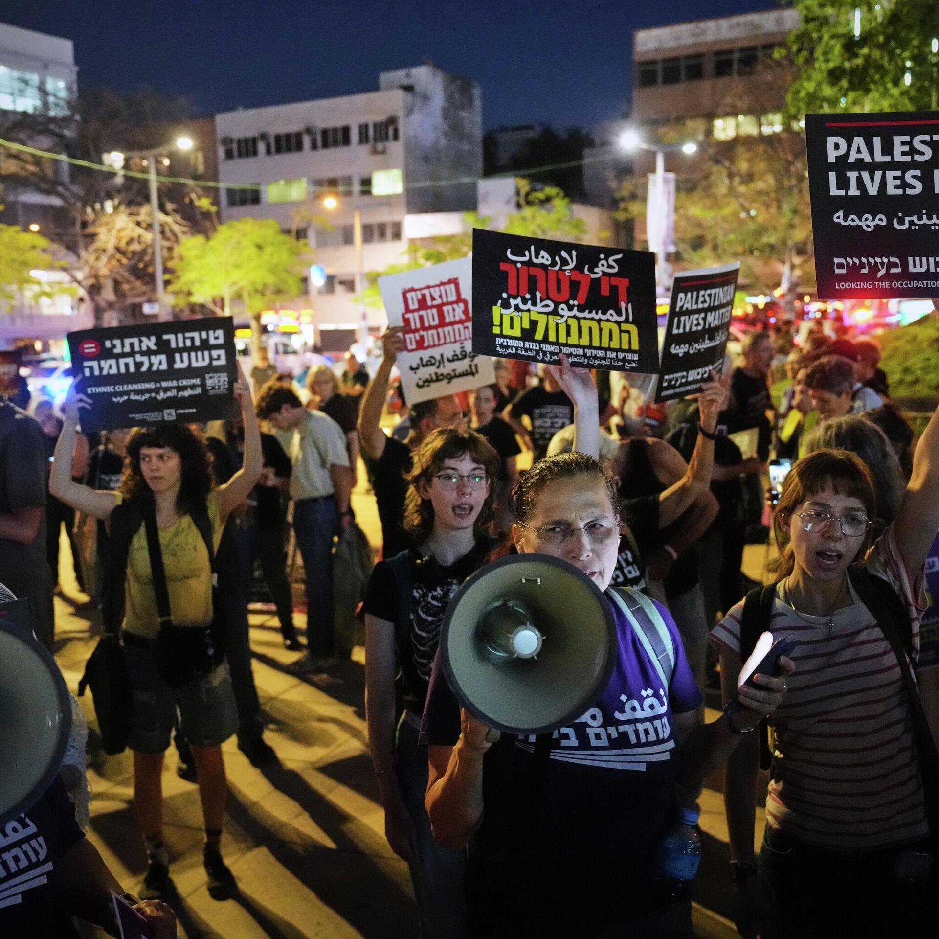 В руках у активистов плакаты с призывами к правительству прекратить вооруженную конфронтацию в регионе. Они скандируют призывы к досрочным выборам в Израиле и защите демократических ценностей.
