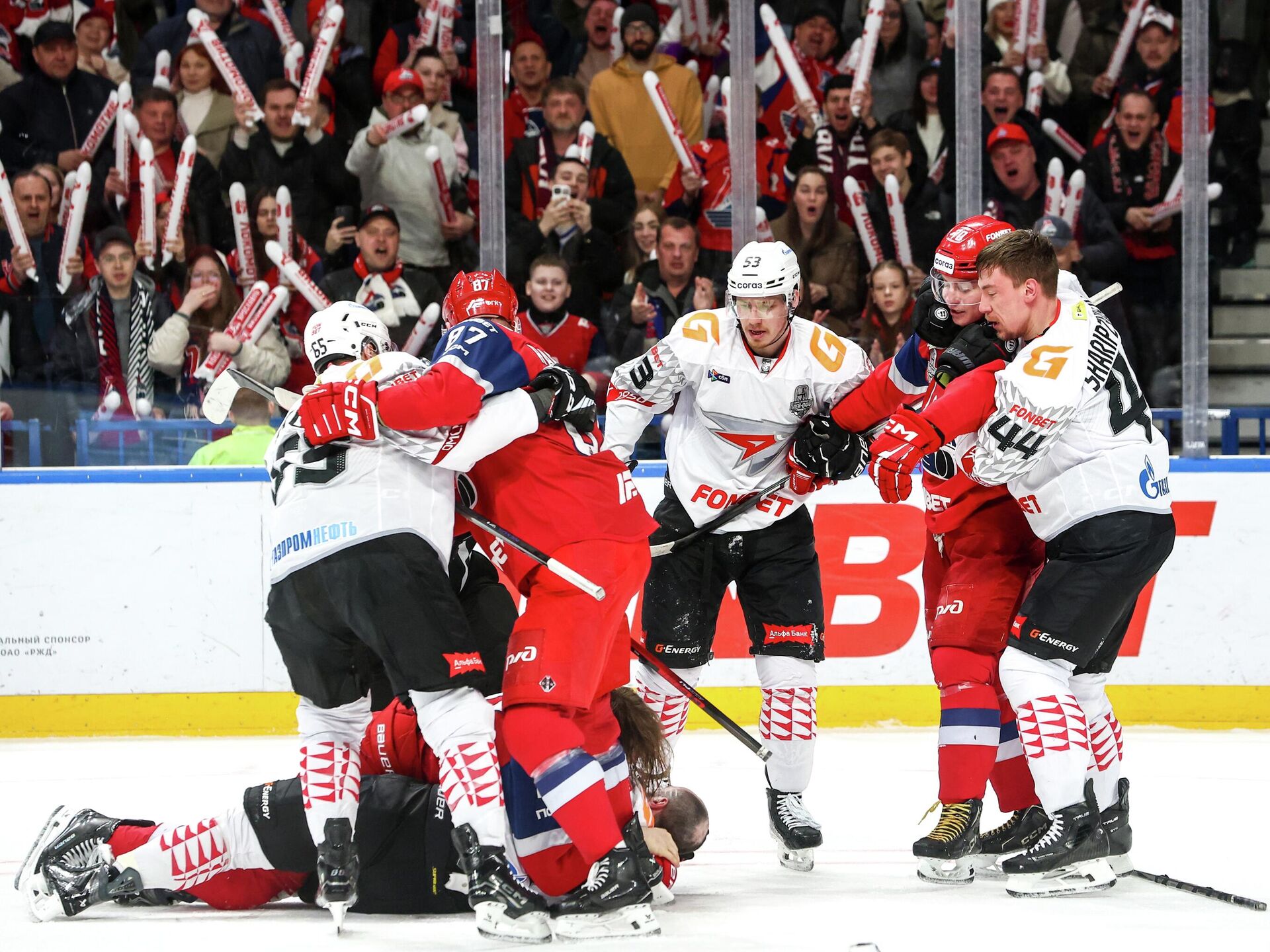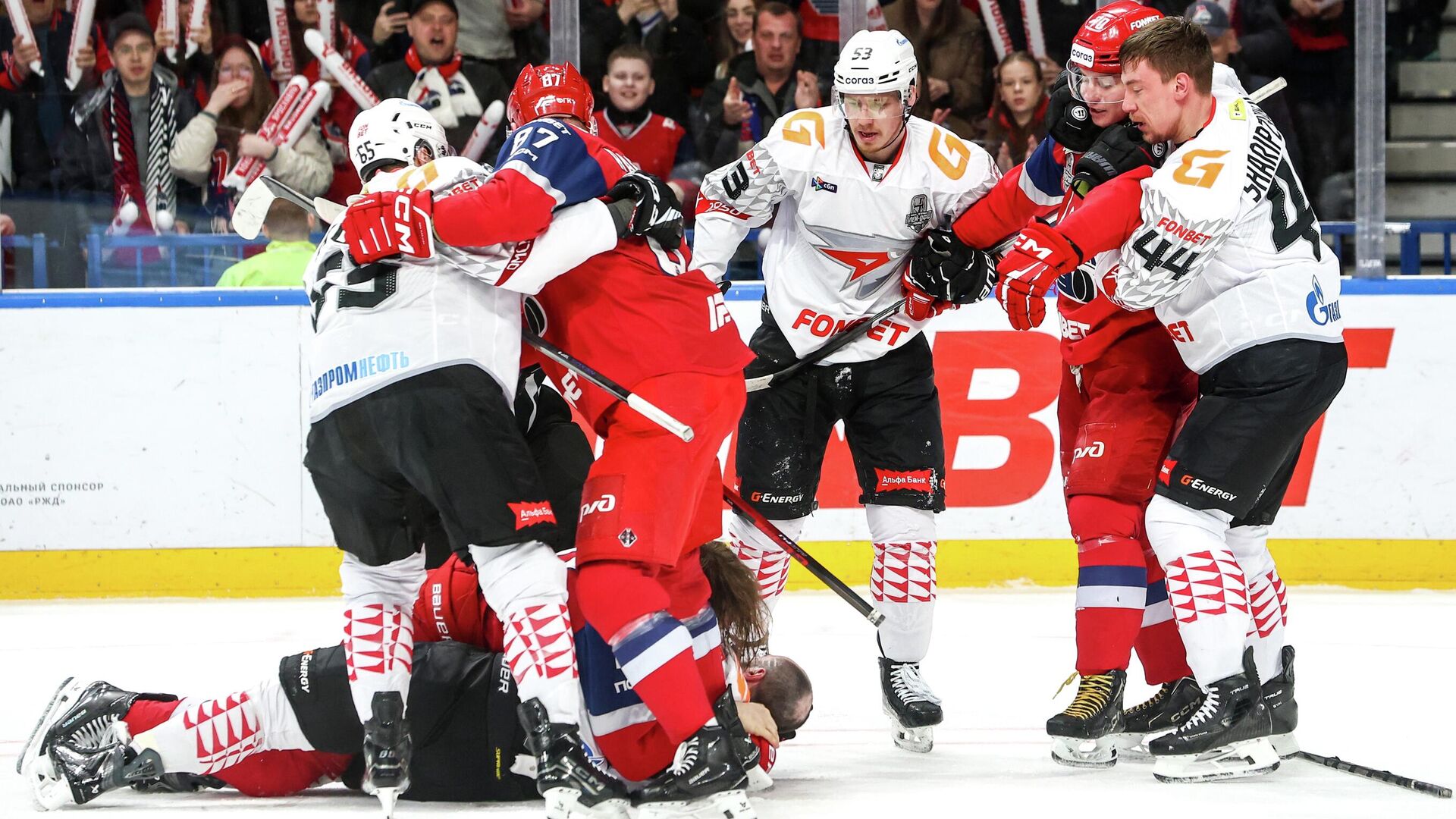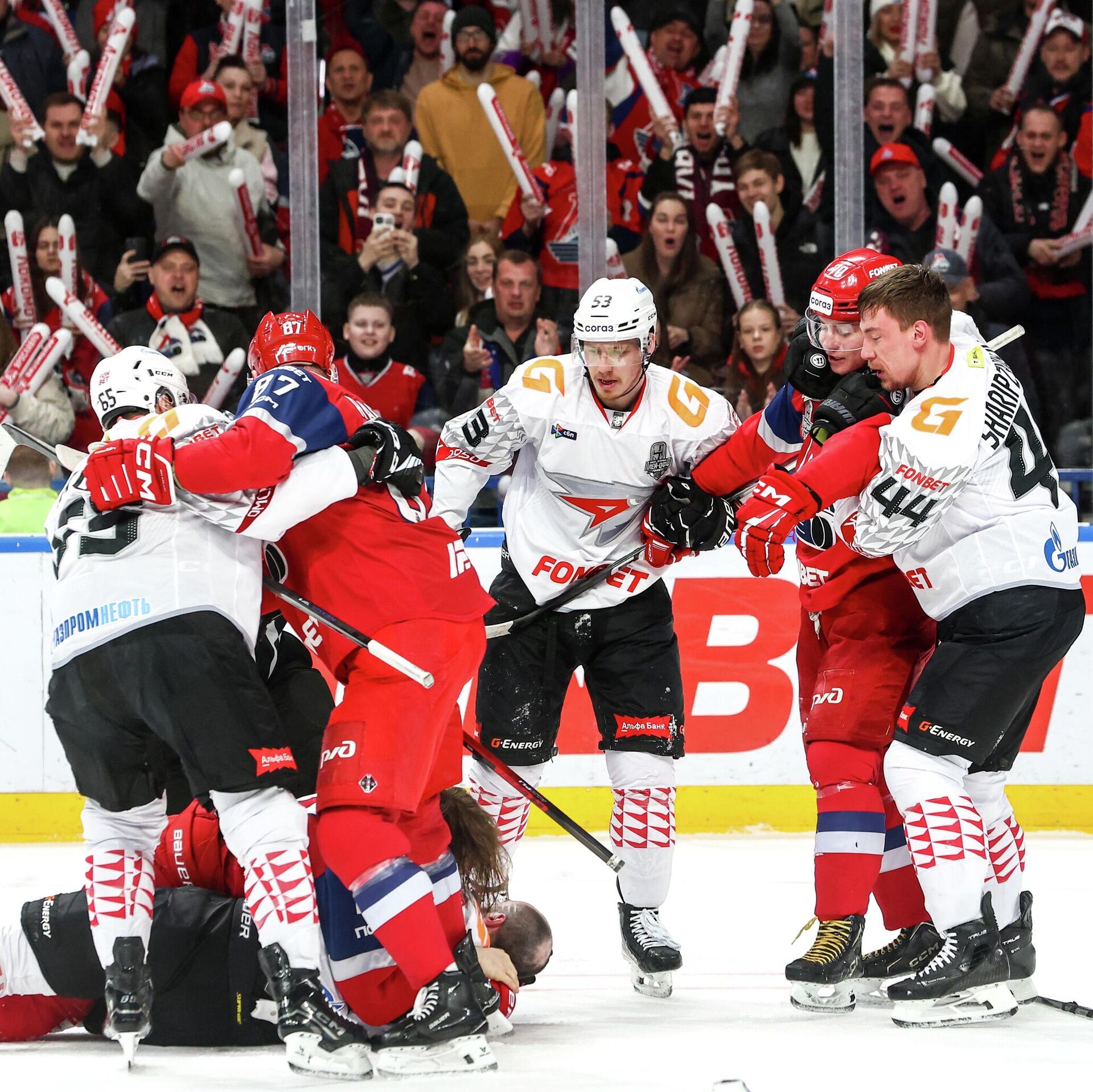 В потасовке участвовали даже те хоккеисты, которые находились на скамейке запасных. В итоге судьи выписали дисциплинарный штраф до конца матча нападающему гостей Кириллу Долженкову и защитнику хозяев Алексею Береглазову. Еще пять игроков, в том числе выступающий за "Авангард" белорус Игорь Мартынов, получили по 10 минут дисциплинарного штрафа.