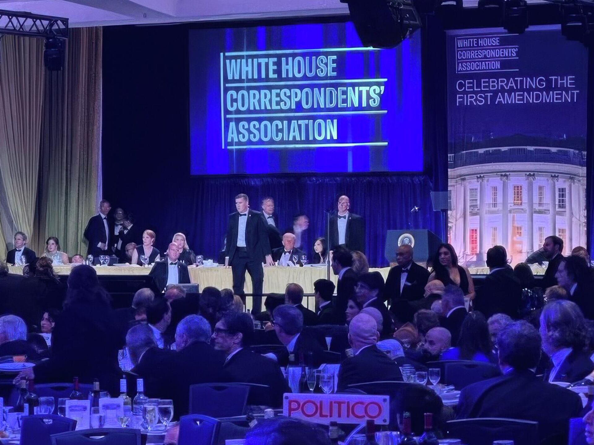 "Секретная служба США в координации с полицейским департаментом округа Колумбия расследует инцидент со стрельбой в районе основного пункта досмотра с металлодетекторами на ужине Ассоциации корреспондентов при Белом доме. Президент и первая леди находятся в безопасности, как и все лица, находящиеся под охраной. Один человек задержан", – говорится в распространенном заявлении.
