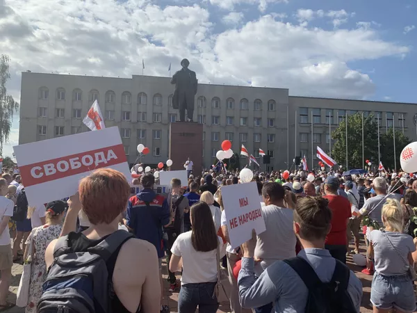 Массовый мирный митинг был запланирован на 14 часов дня. К этому времени на площади Ленина собралось не менее десяти тысяч человек. Среди митингующих были врачи в белых халатах, работники крупных государственных предприятий, которые пришли в рабочих спецовках, десантники ВДВ в тельняшках и голубых беретах, учителя, работники культуры. Многие держали в руках плакаты, портреты погибших на мирных акциях белорусов, развевали над головами бело-красно-белые флаги.