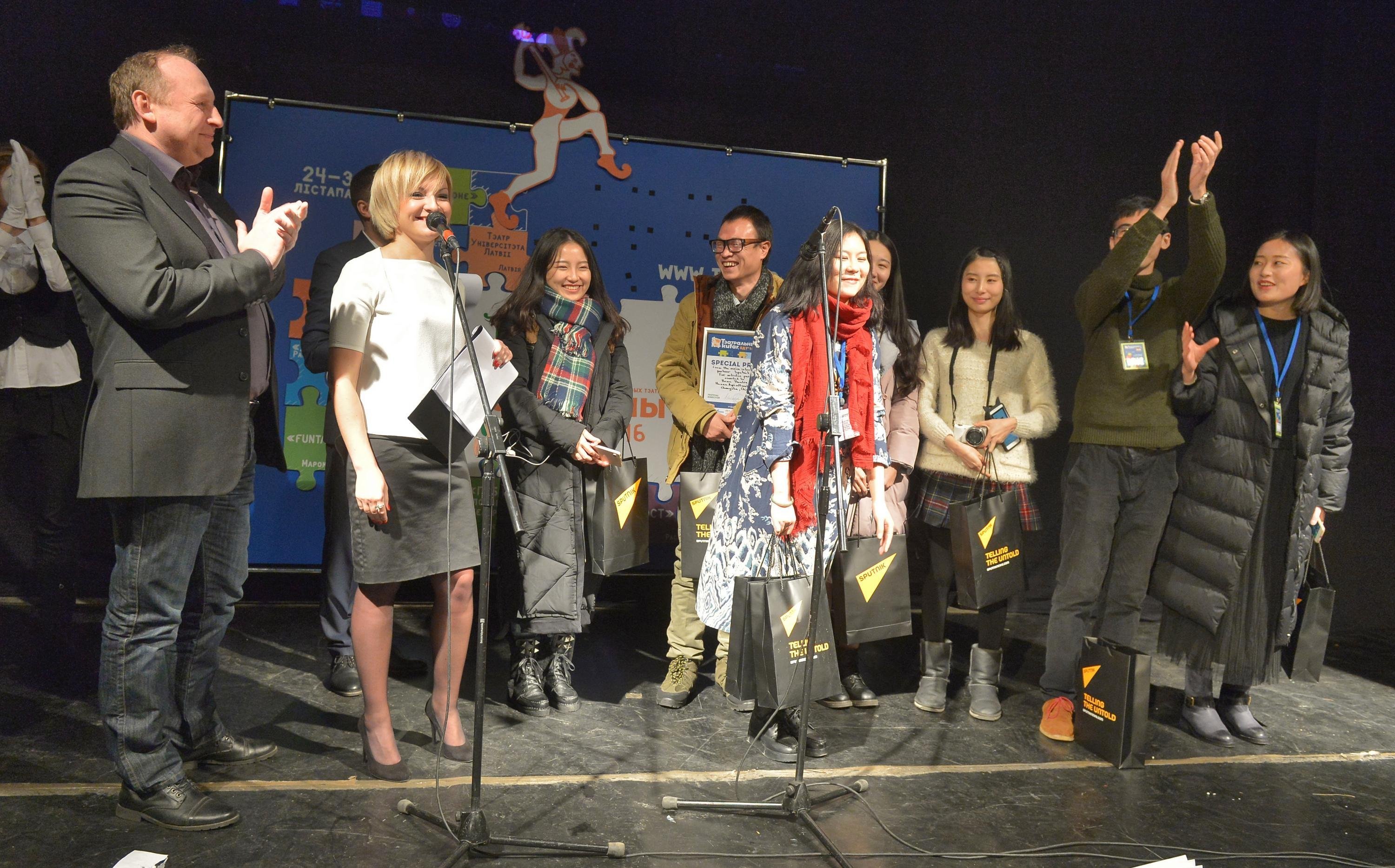 МИНСК, 2 дек — Sputnik. В рамках медиапартнерства с XIII Международным фестивалем студенческих и молодежных театров "Театральный куфар. БГУ-2016" руководитель информационного агентства и радио Sputnik Беларусь Андрей Качура вручил студенческому театру "Home" Хунаньского сельскохозяйственного университета (Китай) специальный приз "За творческую целеустремленность".